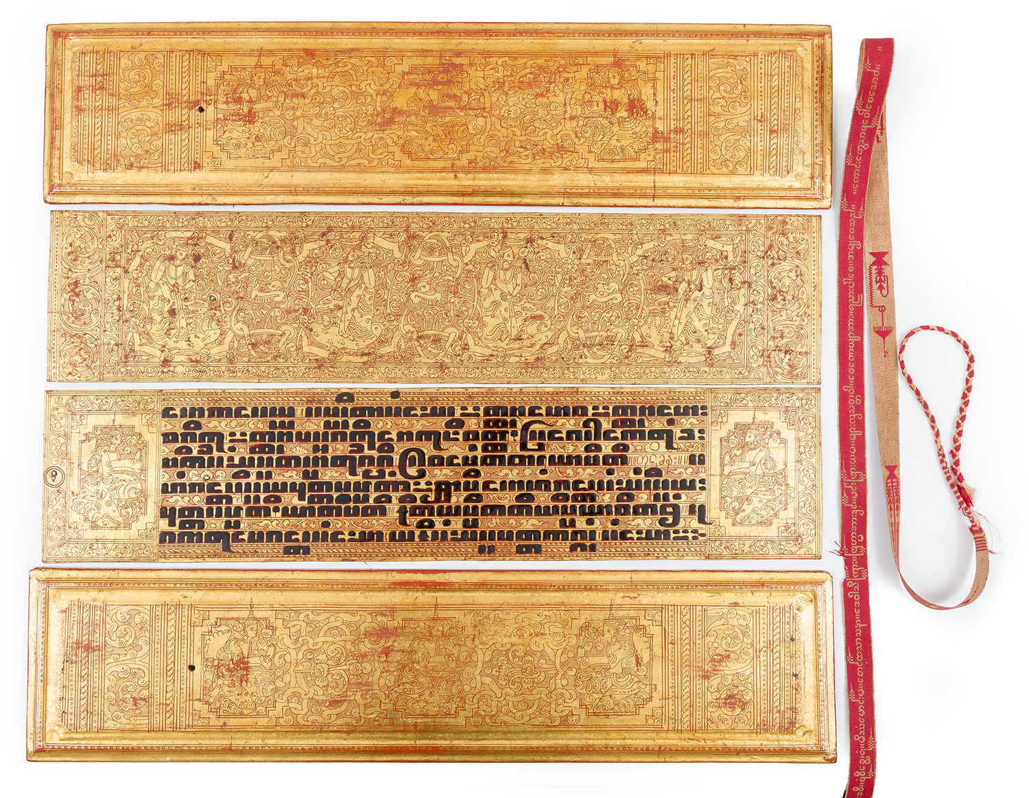 Composed of two lacquered and gilt wood book covers with designs of apsaras amidst scrolling lotus, with two elaborate end-pages depicting figures amongst scrolling lotus and Buddhist guardian lions . The manuscript leaves of gilt lacquered palm leaf, with Pali script in deep brown lacquer. Together with original padded cotton cloth cover, and an intricately woven tape binding with lengthy inscriptions.