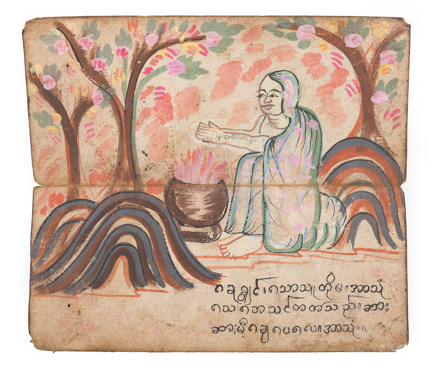 Two books with many pages in each manuscript decorated with colourful paintings of various figures in scenes, interspersed with Burmese script The covers with remnant lacquer coating. The remaining books with lengthy Burmese script interspersed with incantations in shaped grid forms. Minerals on paper in leporello format.