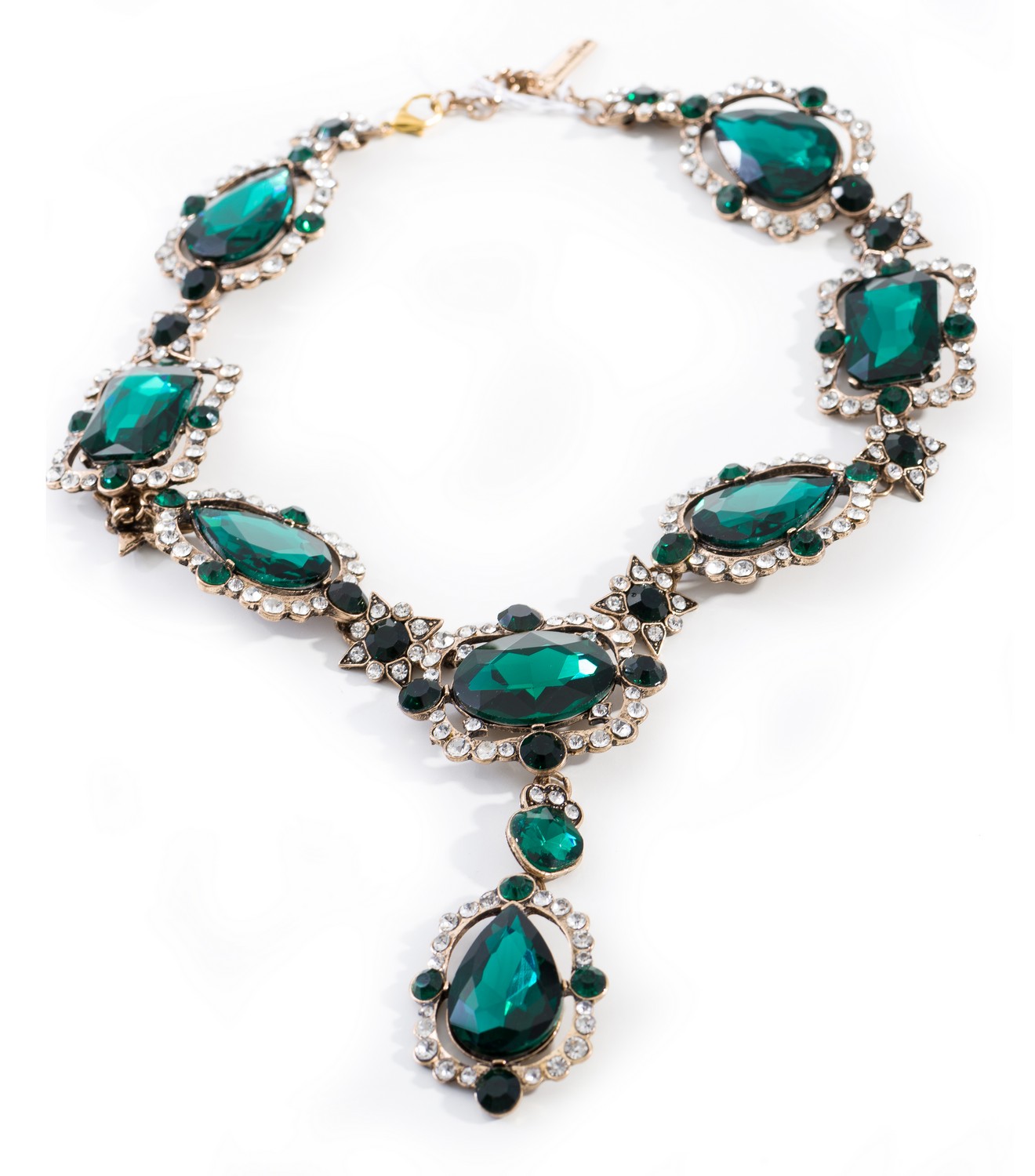Styled with green and clear stones in aged gold metal.