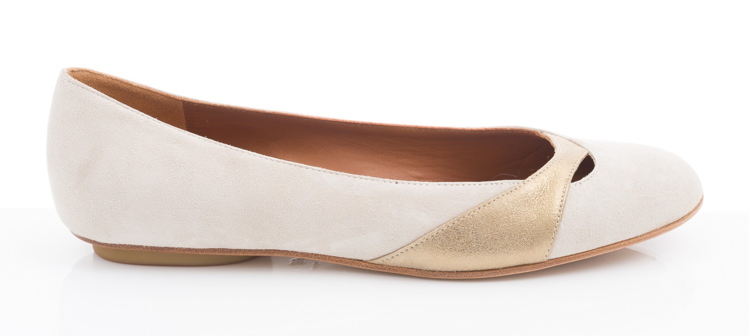 Styled in beige suede with gold leather detail, size 39, boxed.