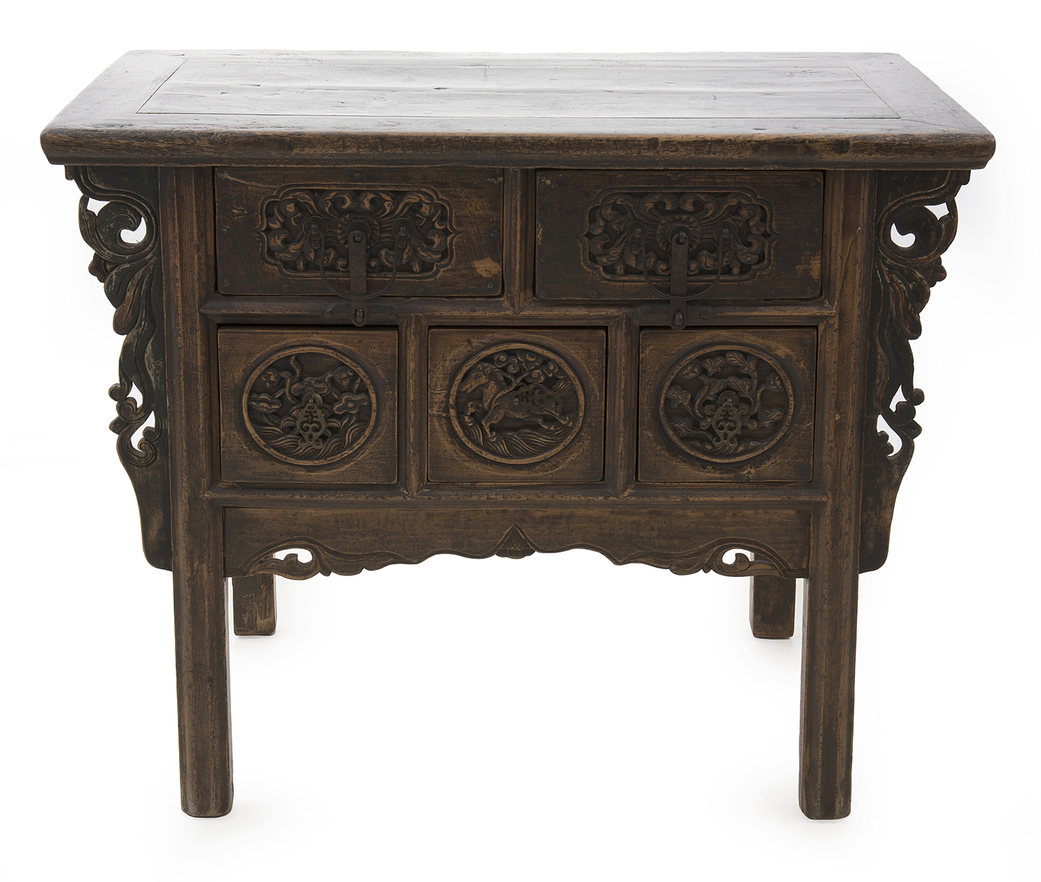 The coffer with relief carved reserves to the drawers including lotus and other flowers, and a horse galloping across waves. With wrought iron and brass hardware.