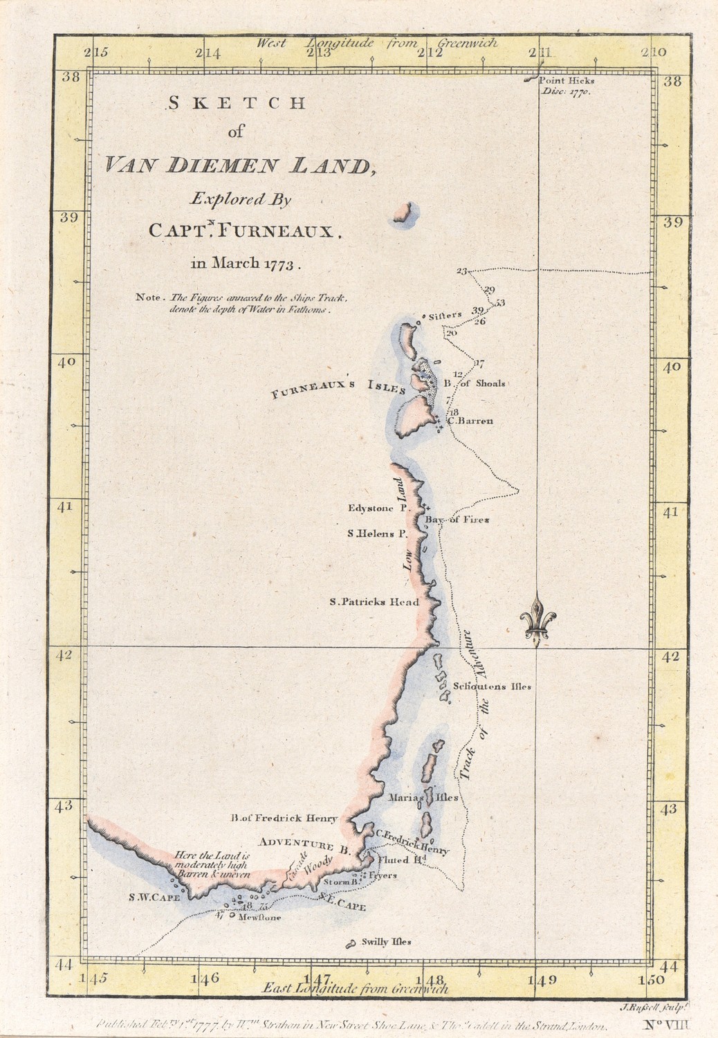 Explored by Captain Furneaux in March 1773, hand coloured. Being the first British chart of Tasmania.
