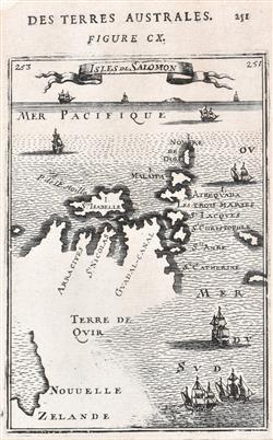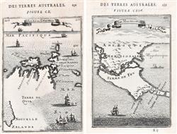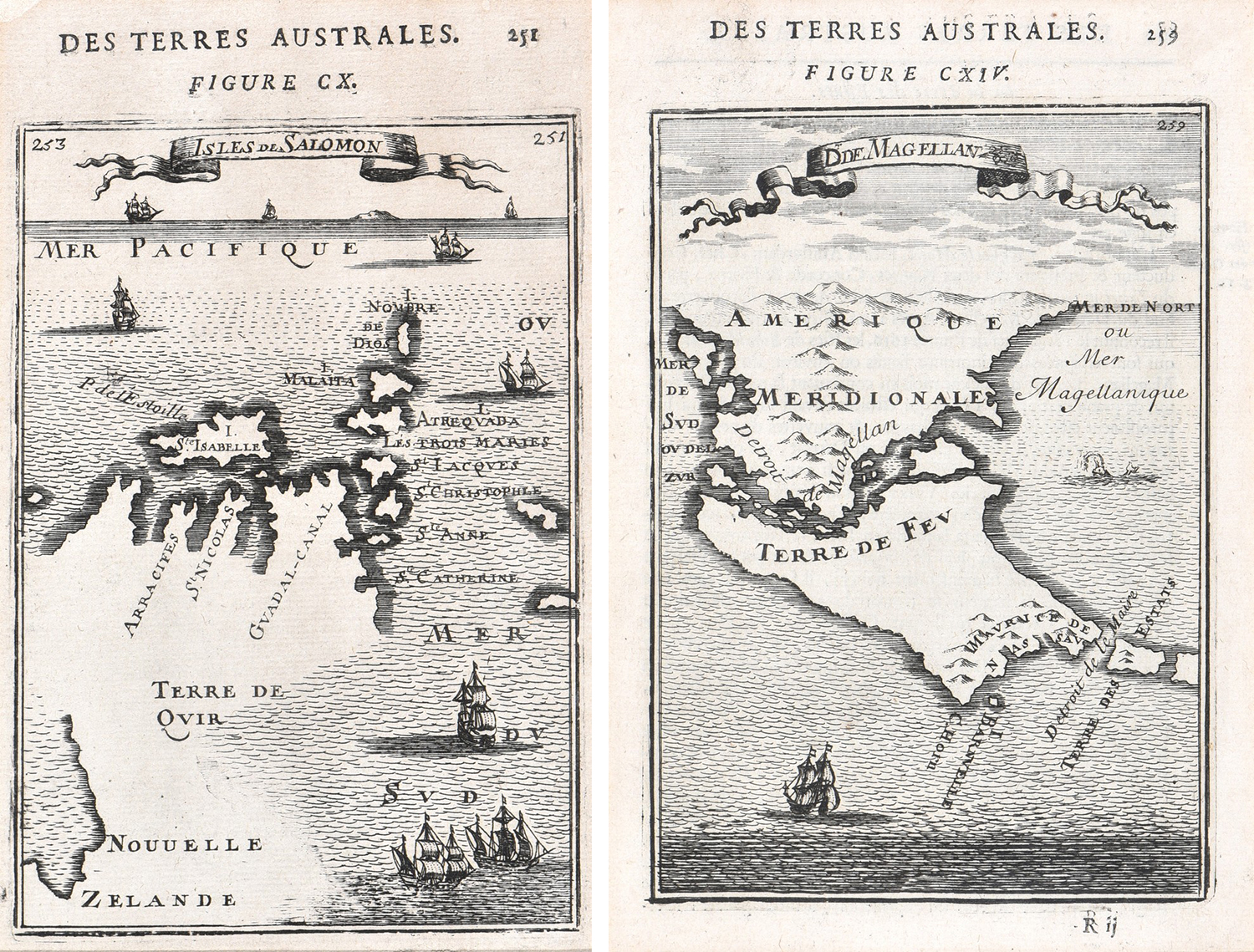 Comprising a hand coloured copper plate map of Cape Horn. Magellan Strait, Chile, & Argentina., 'Des Terres Australes, Figure CXIV, De Magellan' & hand coloured copper plate map of Solomon Islands, Guadalcanal with west coast of New Zealand 'Des Terres Australes, Figure CX, Isles de Salomon'.