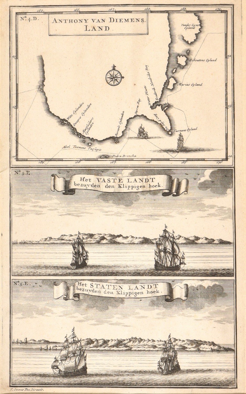 An early map of Tasmania showing the track of Abel Tasman's epic first voyage of 1642-1643, which resulted in the discovery of Tasmania and New Zealand.