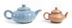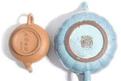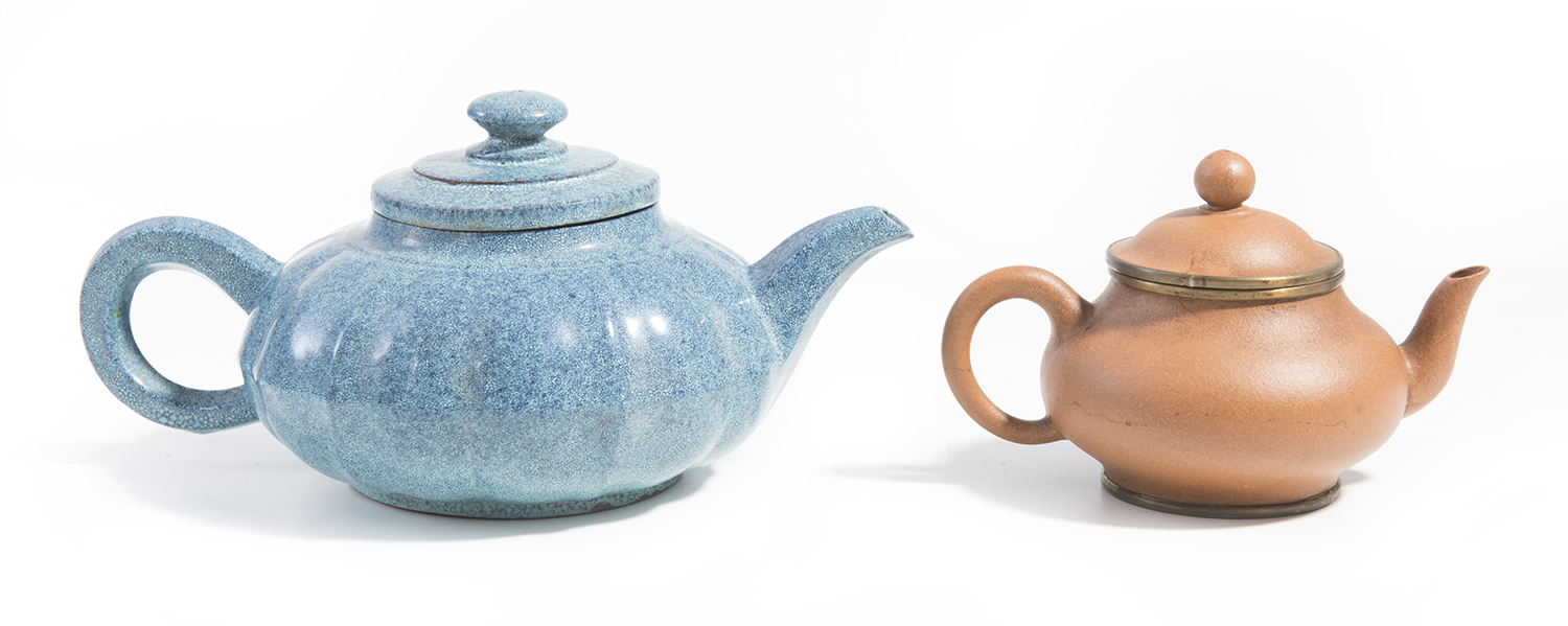 One teapot of deep purplish brown clay in the form of a narcissus flower, covered in a mottled blue 'robin's egg' glaze, with a square impressed seal mark of Shao Ping to the base. The other diminutive teapot of compressed globular form, the mouth-rim, foot-rim and rim of the lid bound in brass, with a seven character inscription to the base reading "Qianlong nian Zhi" (made in the Qianlong period), followed by "Hui Mengchen. The name Hui Mengchen was used by many later potters indicating superior workmanship. The brass mounts indicate that this teapot was made for the Thai market, the mounts having been added in Thailand at the time of importation.
