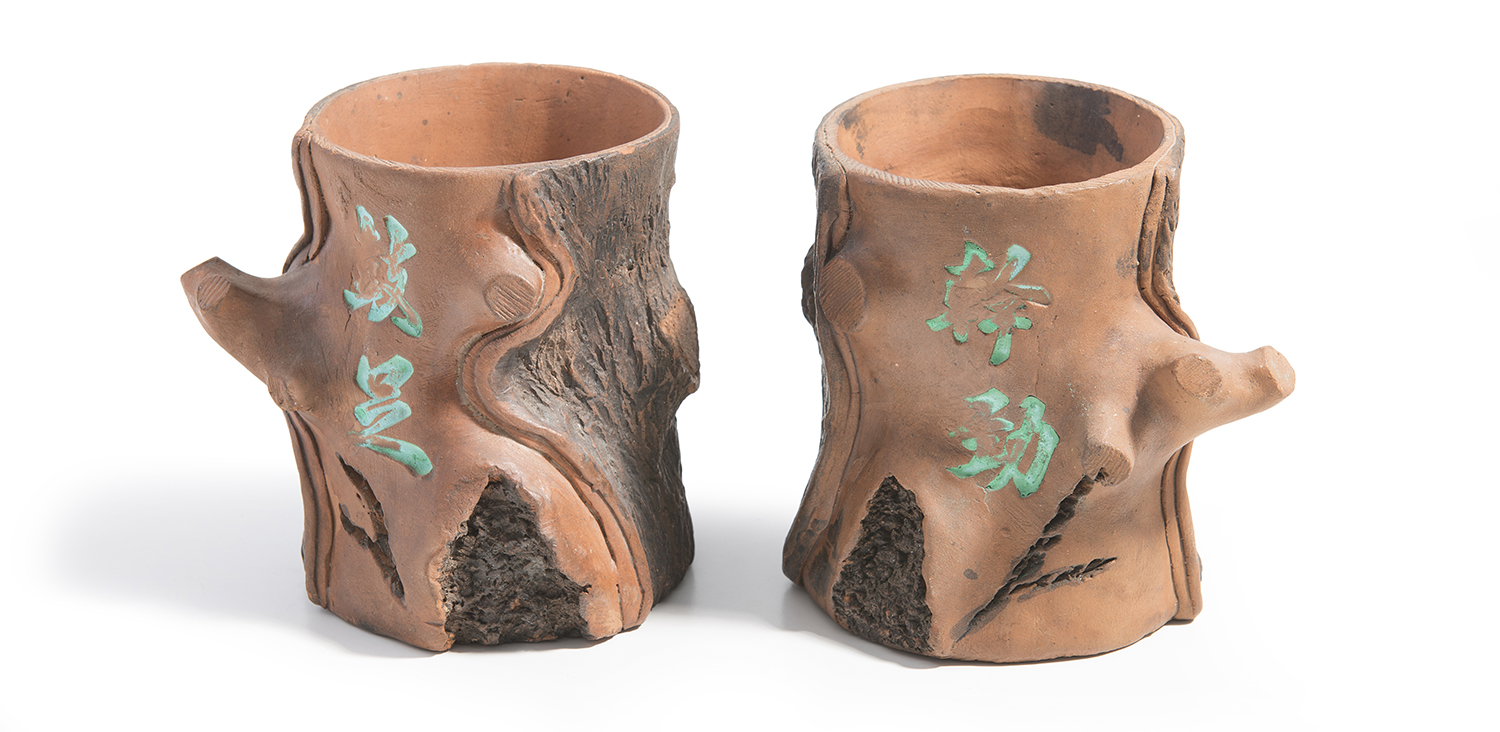A PAIR OF CHINESE INSCRIBED TREE TRUNK FORM YIXING BRUSHPOTS