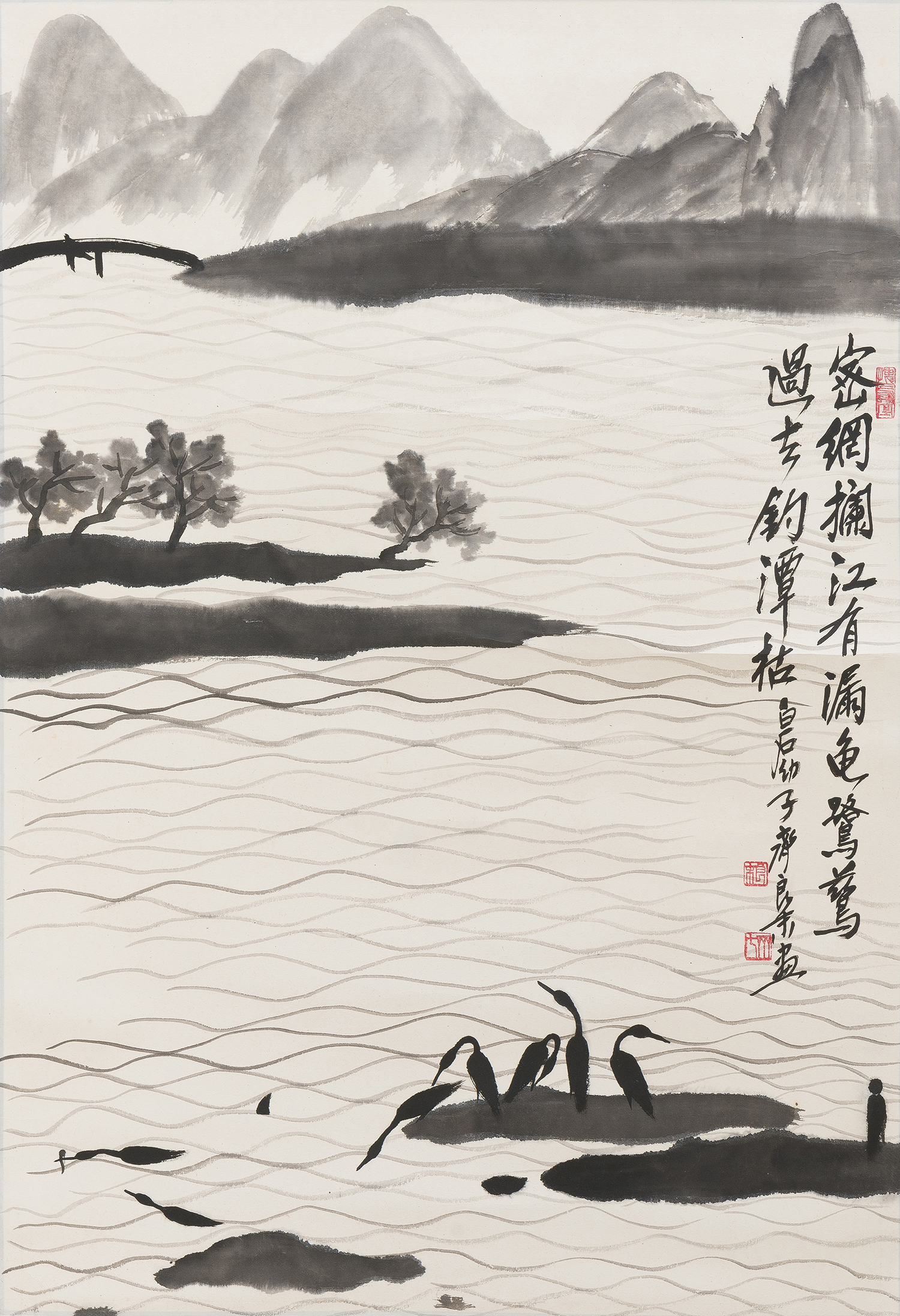 The landscape with water and birds are in the Qi Baishi style, painted by the famous artist's youngest son. With the exception of a small figure of the right hand corner, representing the artist (Liang Mo) appreciating the achievements of his father, thus this painting is autobiographical in nature