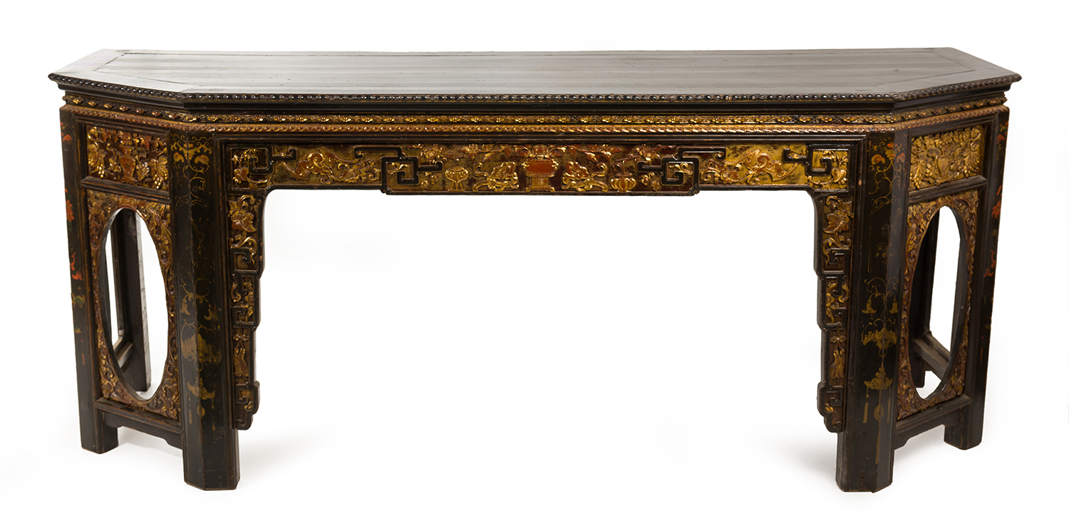 The table of deeply carved and lacquered softwood, decorated with bats, lingzhi fungus, scrolling flowers, vases and precious objects in black, gold and red lacquer.