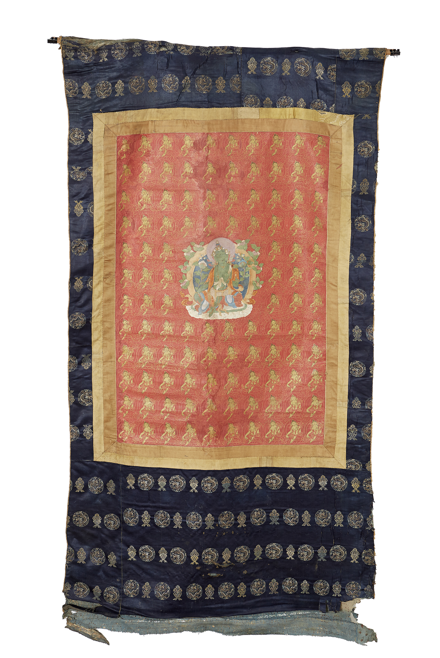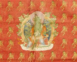Depicting green Tara to the centre on a single lotus base, within a golden mandorla with flowers, surrounded by one hundred and eight small gold Taras and scrolling foliage, evenly spaced on a red ground.