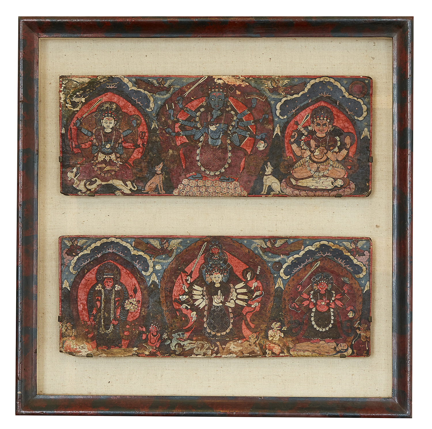 The covers painted on both sides, the two outer sides with four manifestations of the Goddess Durga, the two inner sides with three manifestations. The covers mounted in an open frame with bronze supports.