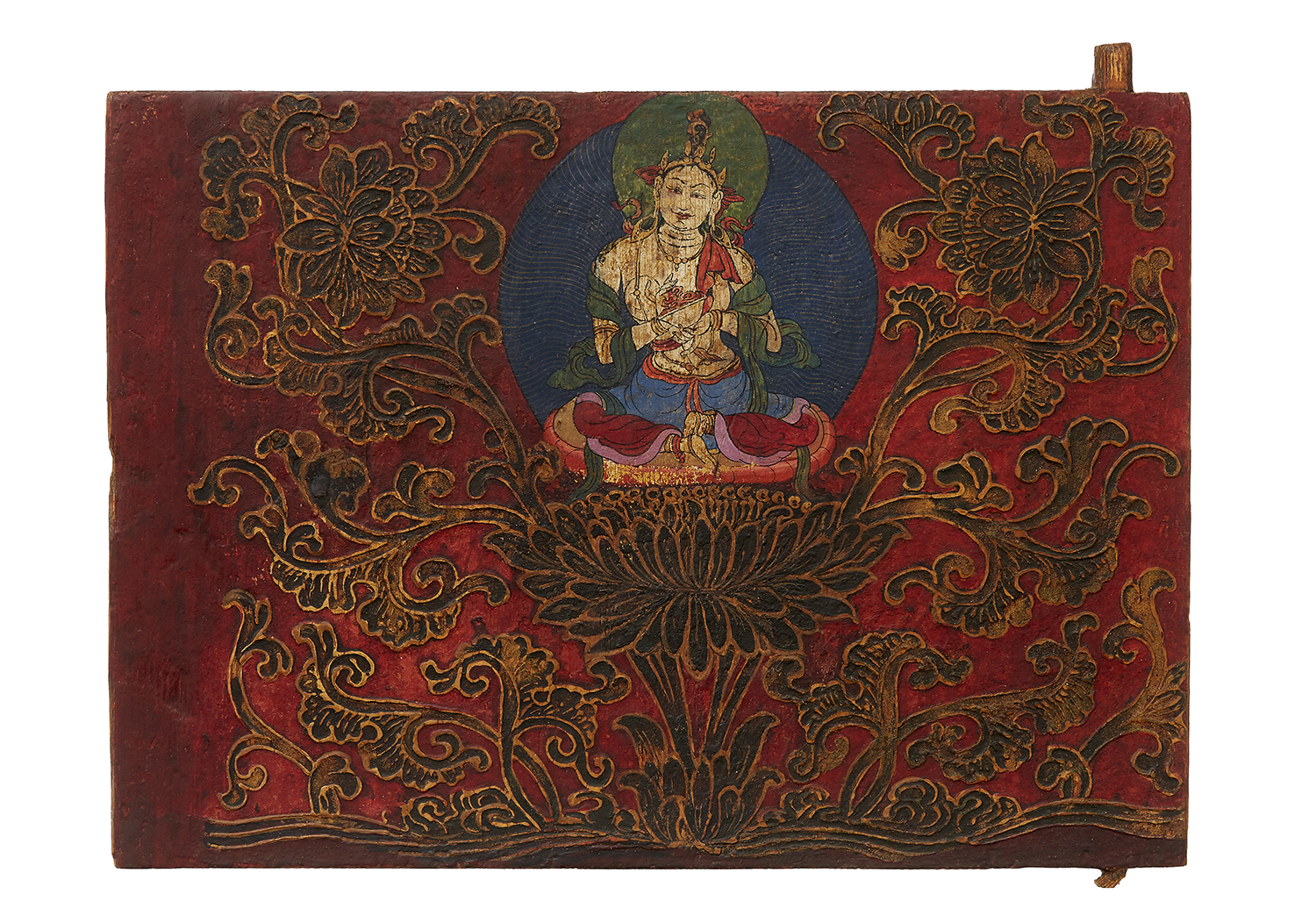 A shrine door painted with an image of Tara seated on an elaborate lotus, surrounded by further scrolling lotus in painted raised gesso work.