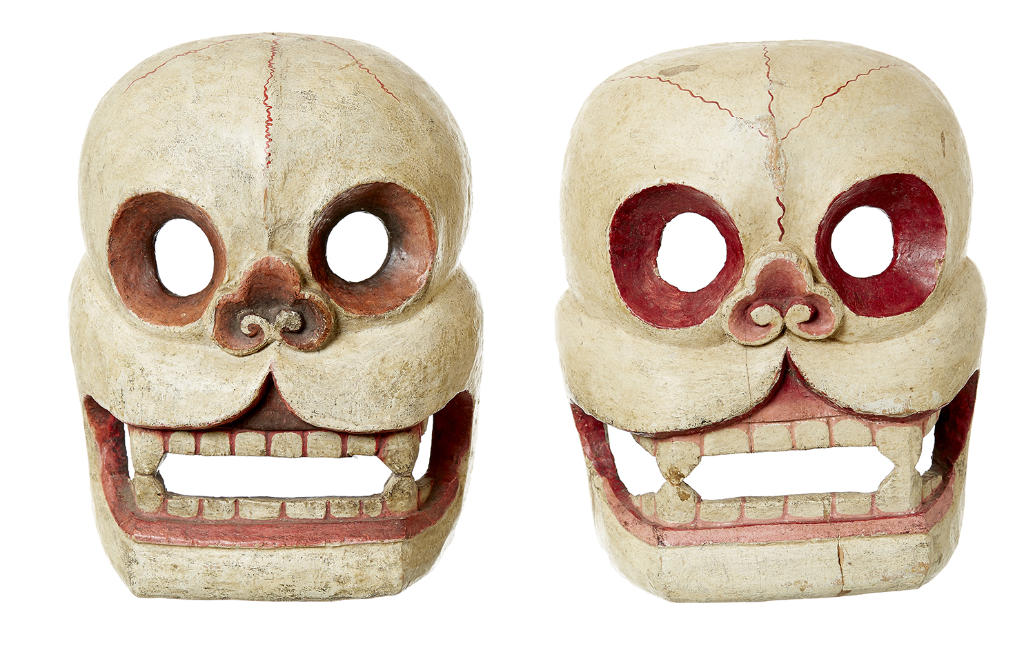 The masks of beautifuly carved and painted wood, depicting the Citipati, male and female lords of the charnel grounds.
