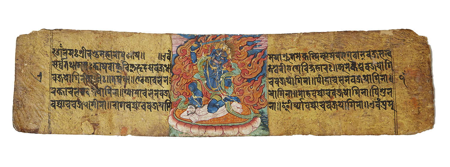 The deity depicted is the main subject of the Solitary Hero Tantra (Chandamaharoshanatantra), astride a prostrate human figure, within a flame mandorla. Also written on this folio flanking the image are the opening lines of this Tantra.