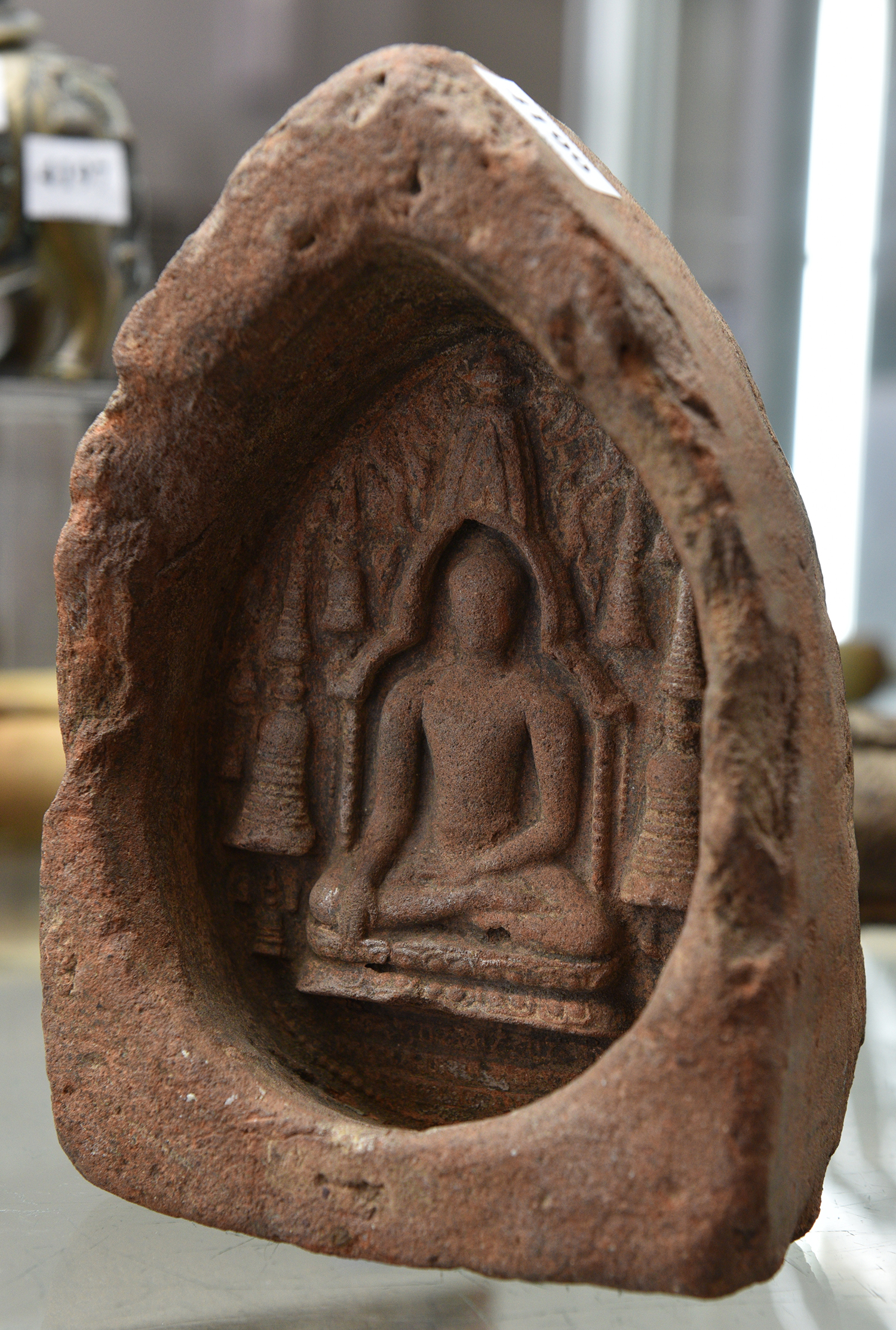 Of moulded terracotta, depicting the Buddha seated at Bodhgaya surrounded by stupas.