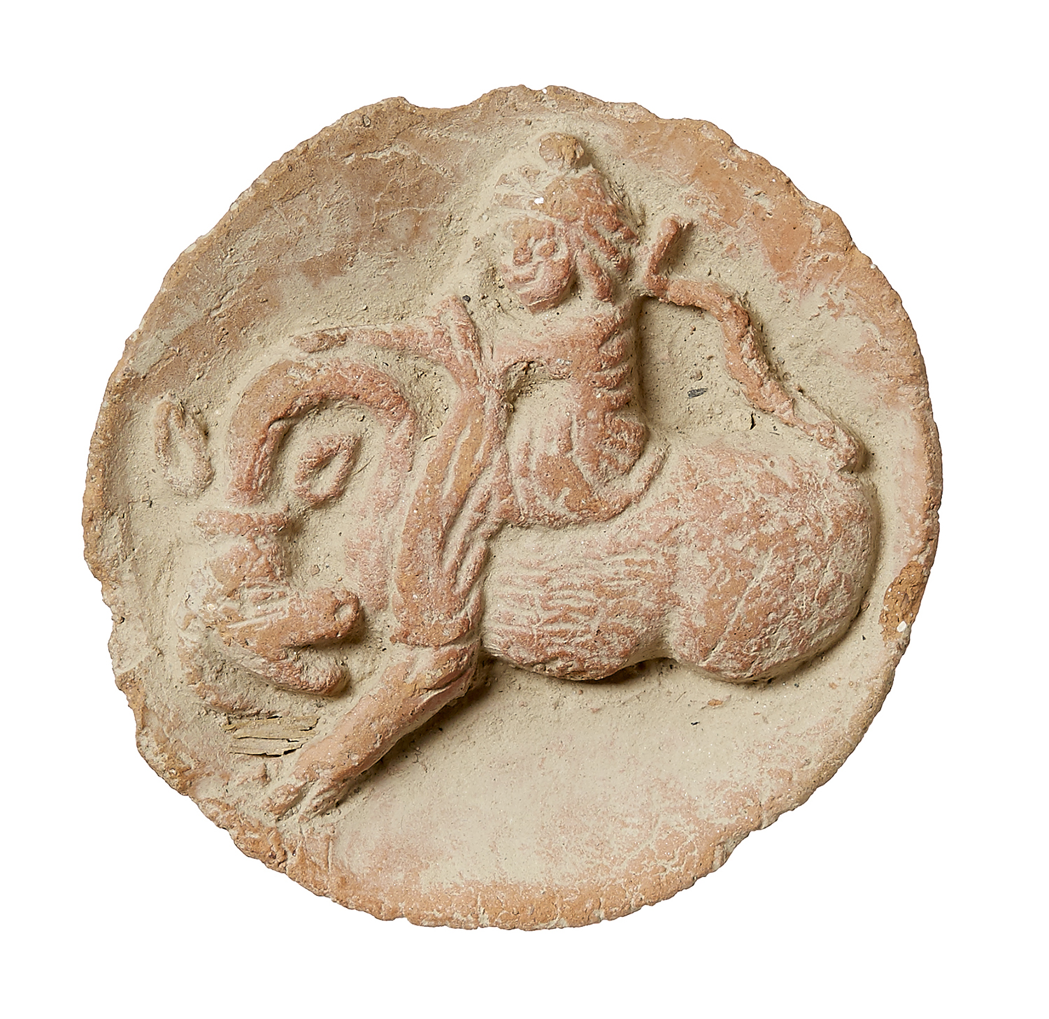 The pressed round terracotta tablet with a relief image of an anthropomorphic deity, part winged dragon, part human.