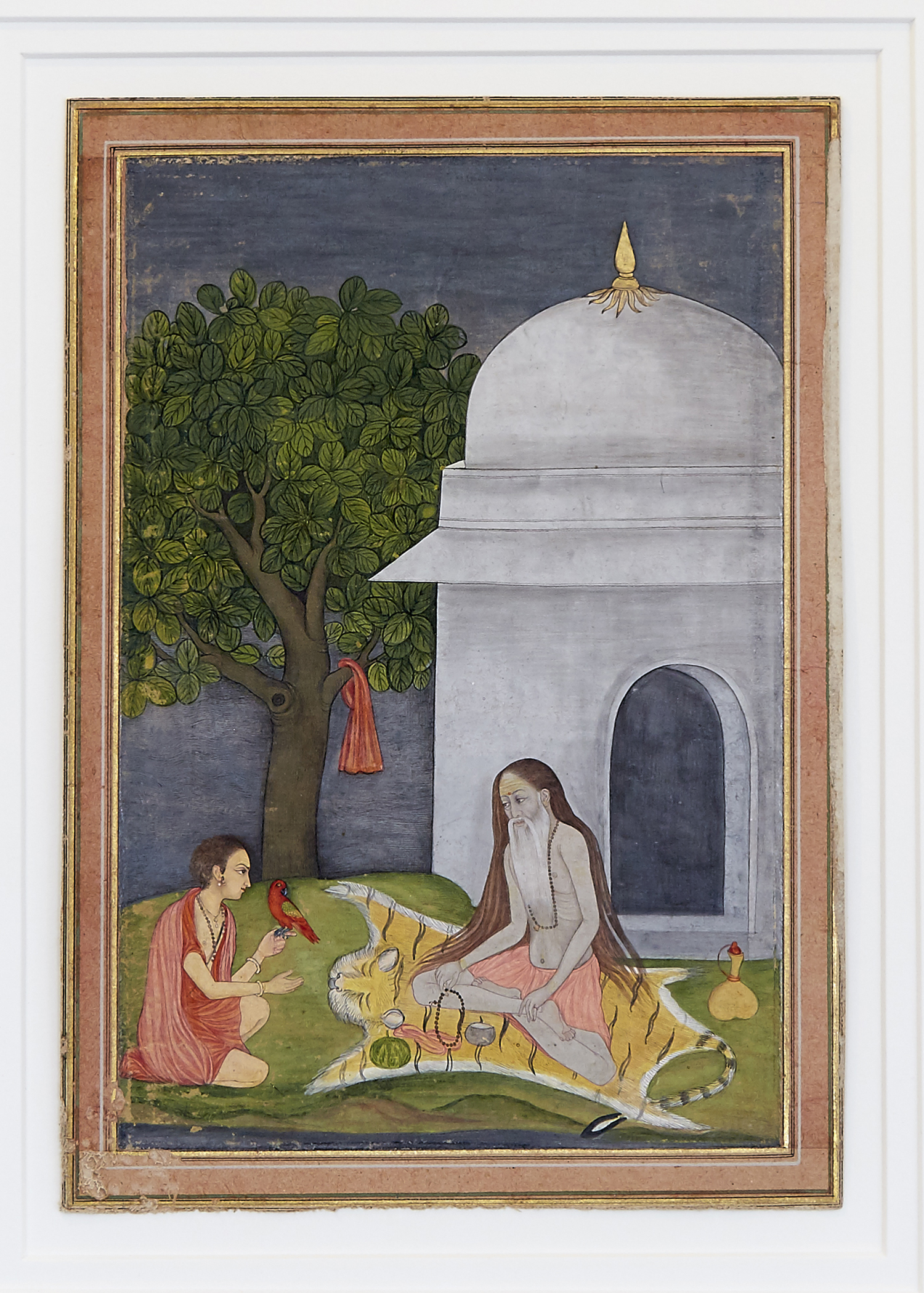 Depicting a yogi seated on a tiger skin before a forest shrine, giving audience to a young prince, painted on paper in the Mughal style, Delhi school. On the reverse is an engraving of St John the Evangelist, with the legend 'Wm Reich exec. December 27'. Framed.