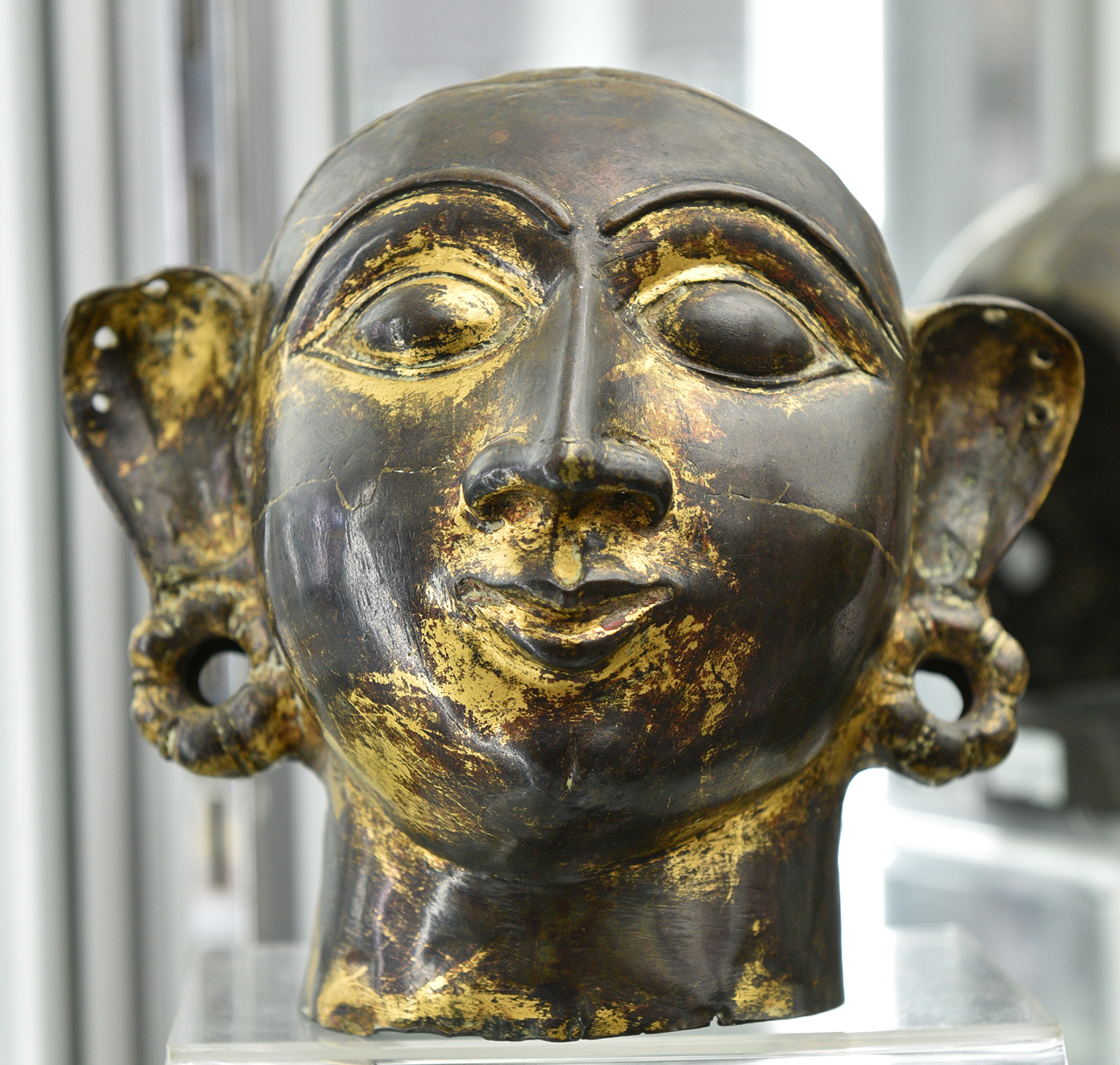 The repousse copper head in the round, with remnant fire gilding. Together with a later black metal stand.