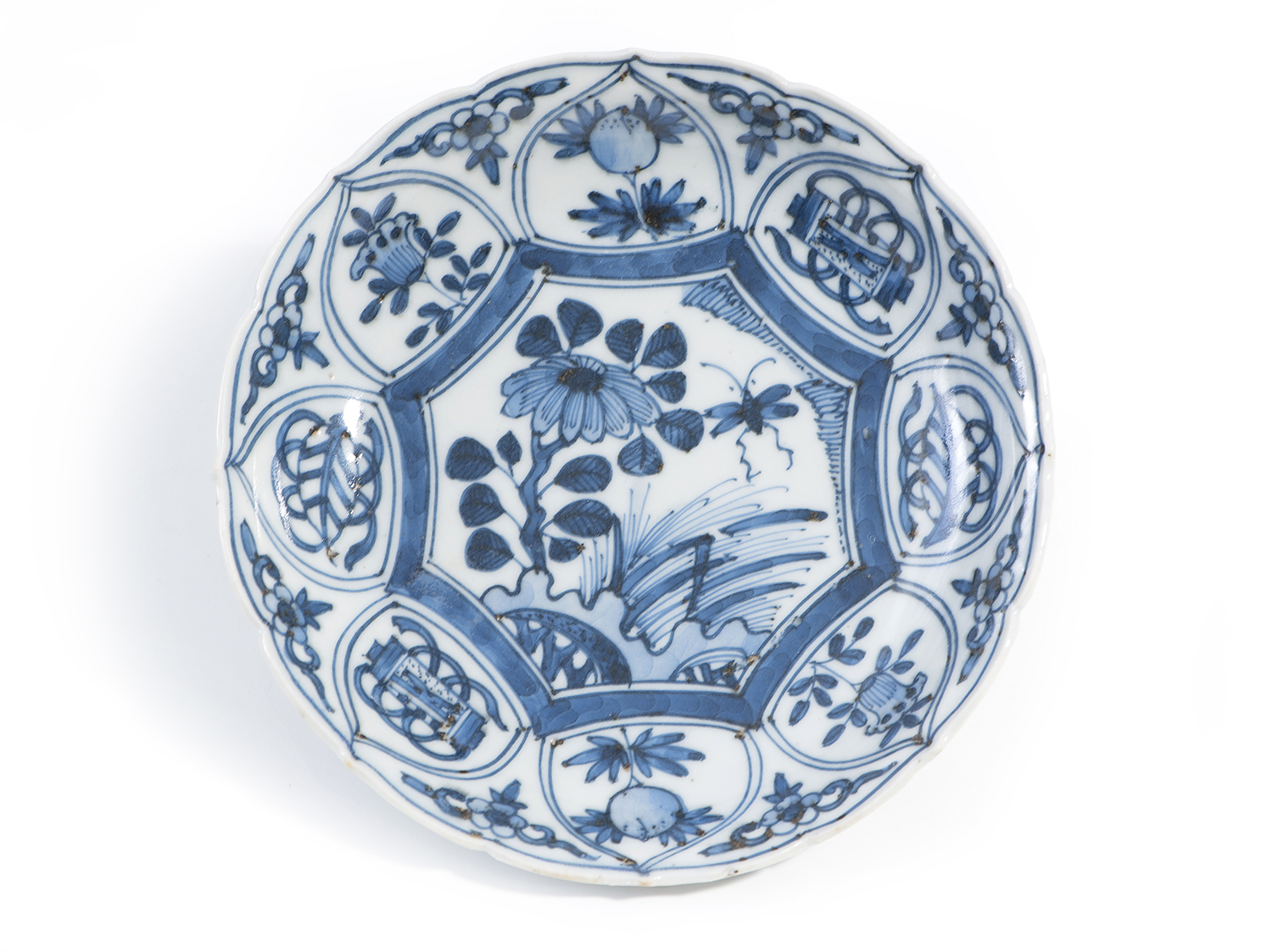 The central flower-shaped reserve decorated with a butterfly and chrysanthemum, the eight petal shaped reserves in the cavetto painted with precious symbols and flowers.