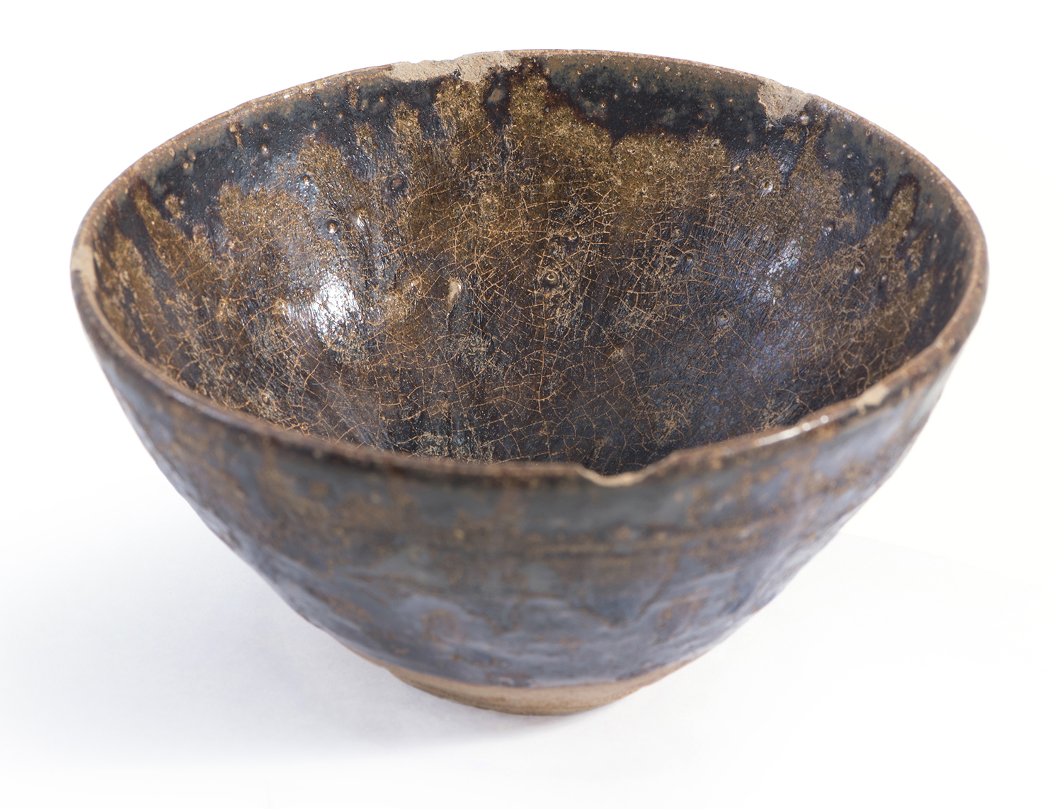 The crackled glaze with wear and mineralised patina from burial, and 7 chips to the mouth-rim.
