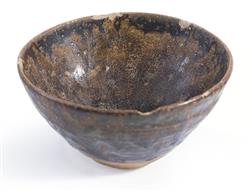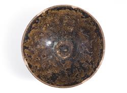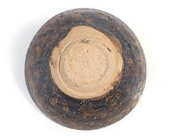 The teabowl of rounded conical form, the interior and exterior with a deep brown and amber glaze in a tortoiseshell effect, the unglazed base showing a sandy buff coloured clay.