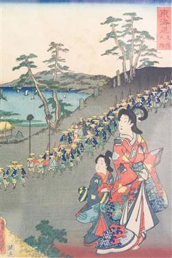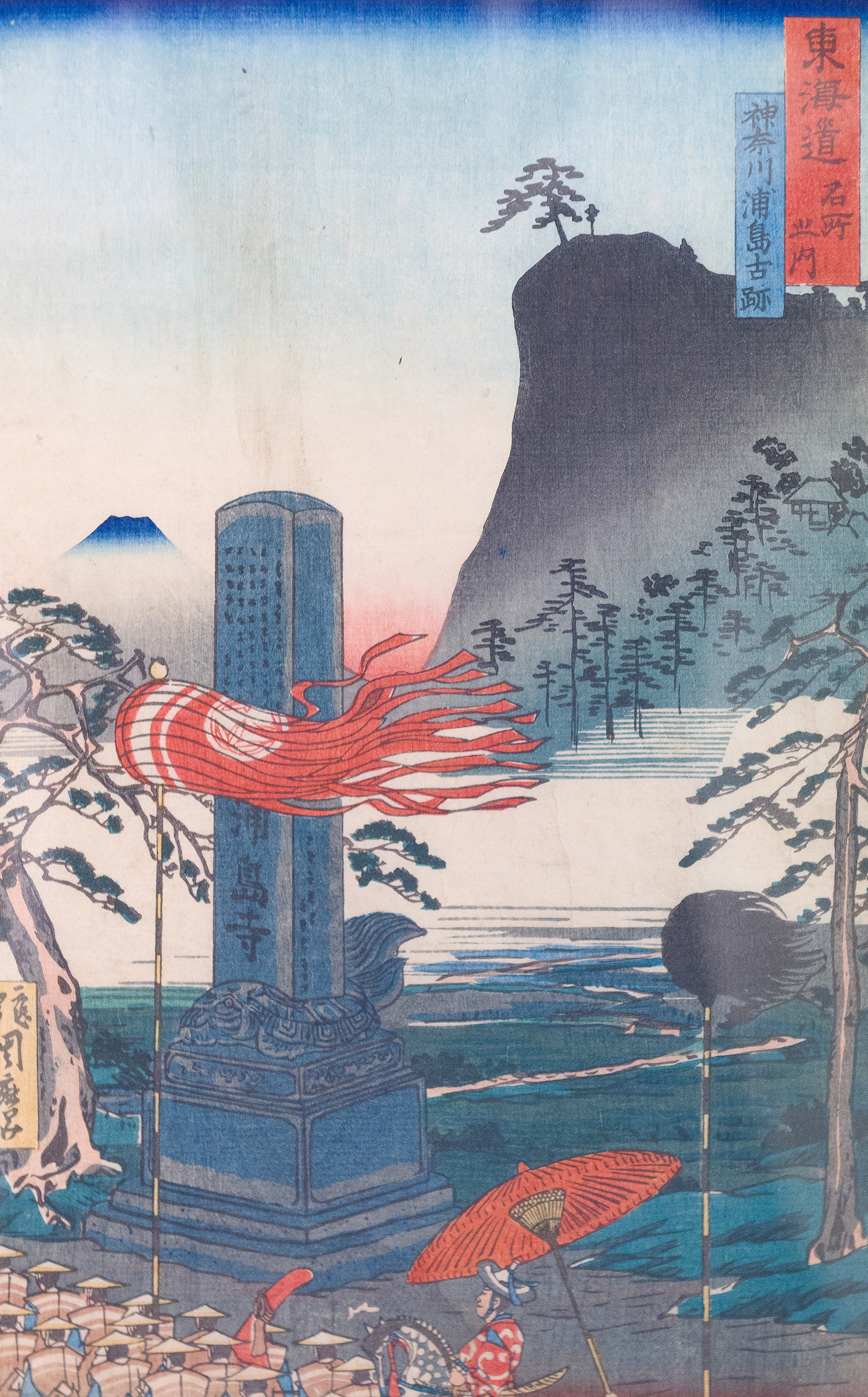 Two Oban Tate-e prints, the first 'Oiso', from the series: Scenes of Famous Places along the Tokaido Road - Tokaido Meisho Fukei, Edo period, 1863. Signed Oju Nanajuhassai Toyokuni hitsu, in toshidama cartouche (78 year old Toyokuni). The second, 'Historic Site of Urashima in Kanagawa' - Kanagawa Urashima koseki, from the series: Scenic Places of the Tokaido - Tokaido meisho no uchi, Edo Period, 1863. By Kawanabe Kyosai.