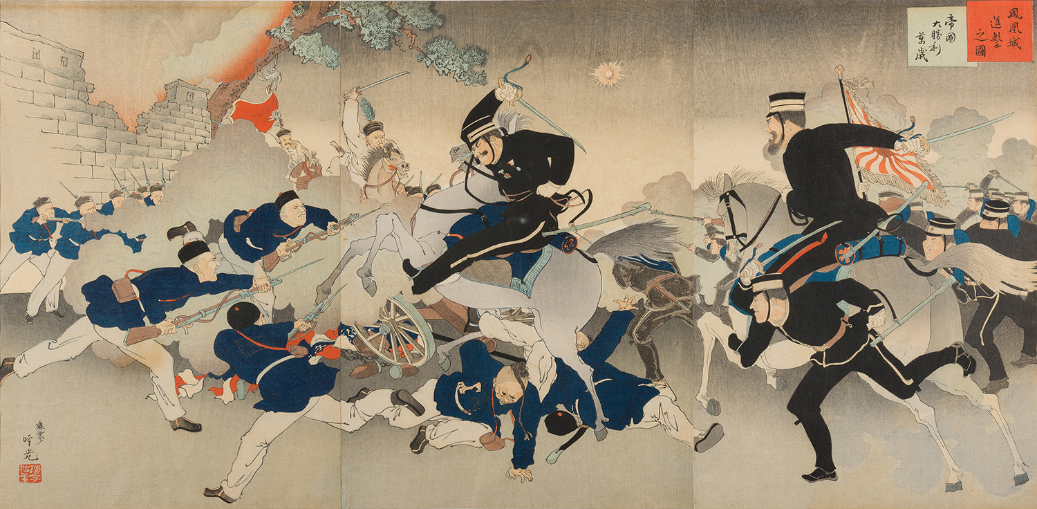 Classic battle scene of the Sino-Japanese war. Oban size triptych.