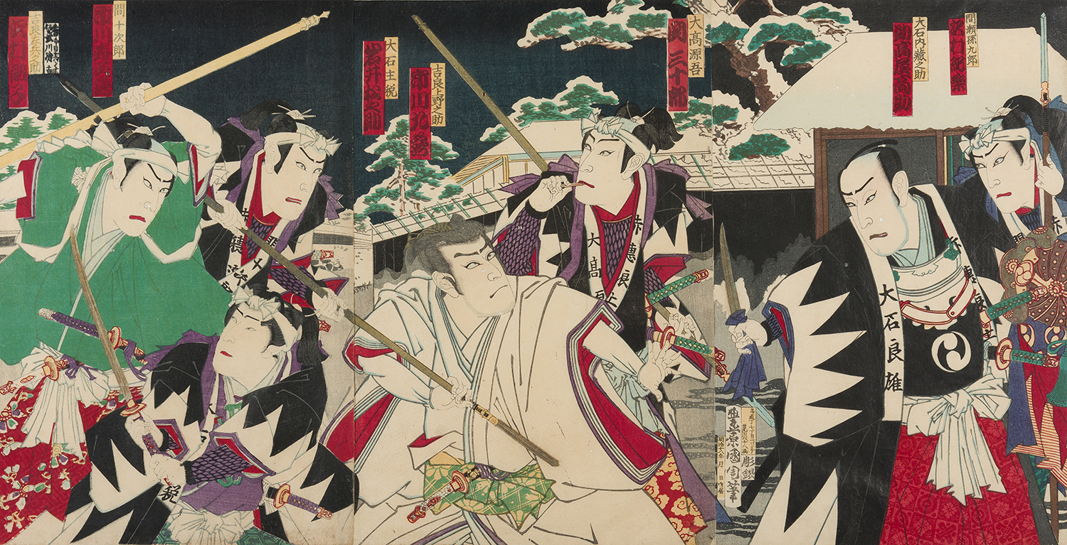 Dynamic and lively Yakusha (Actor) triptych of opposing Samurai in a street confrontation. Oban size.