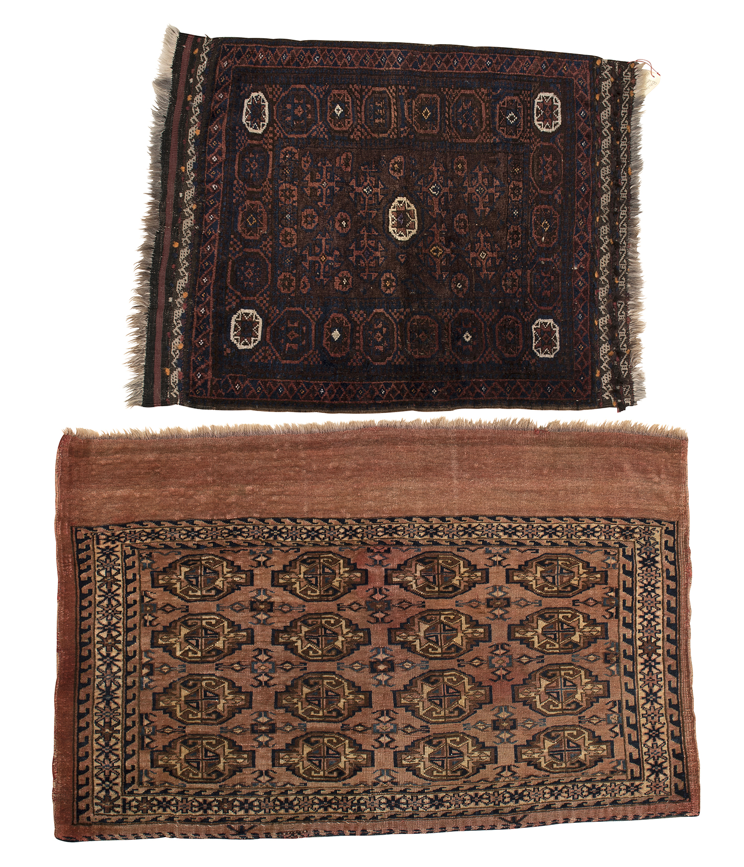 The chuval with a field composed of sixteen chuval guls, interspersed with gurbaghe guls. The Baluch bag face with geometric guls within a stylised flower border.