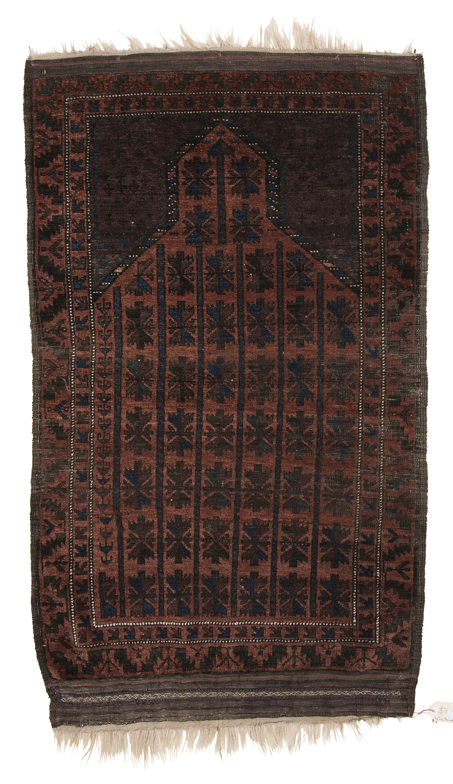 The mihrab shaped field with stylised flowers against a madder red ground.