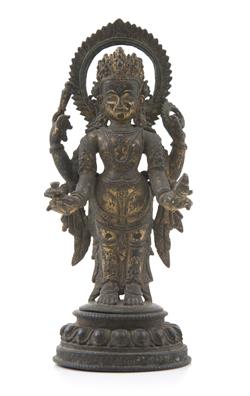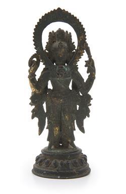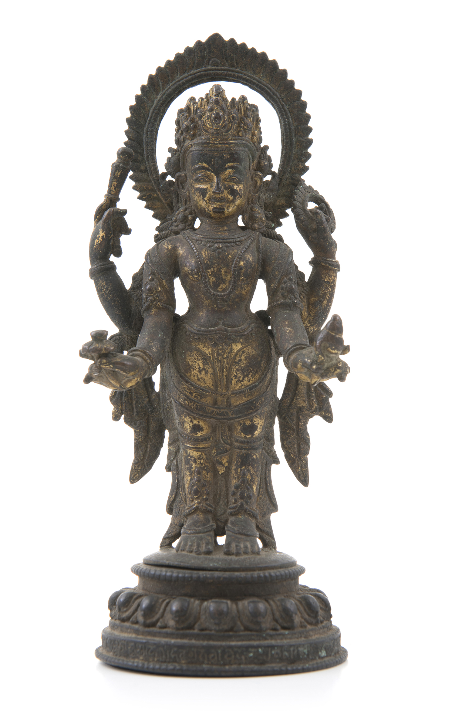 Standing on a single lotus base, holding the conch, mace, lotus bud and dharmacakra in his four hands, wearing a crown and elaborately detailed dhoti and jewellery, with a flame mandorla behind his head, with an inscription around the bottom of the lotus base reading "[Nepalese] era 658, waxing fortnight of the month of Asadh, for the departed Babudev..." this fire-gilt high copper-content bronze is finely cast and beautifully detailed.