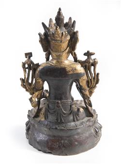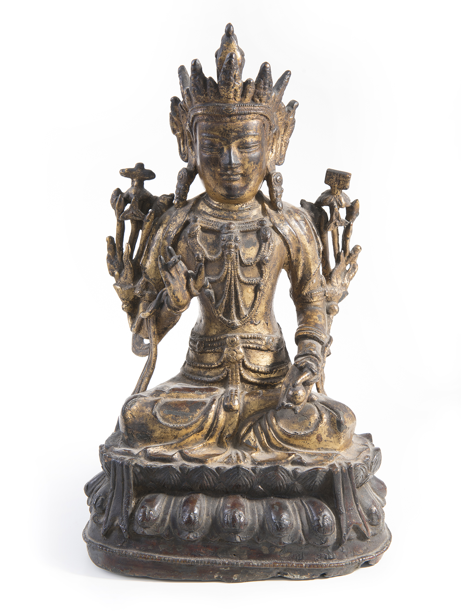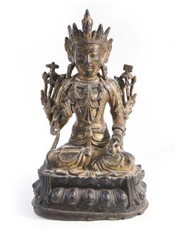 The tip of the sword missing, one of the ribbons attached to the left elbow showing possible old repair, some small dents throughout, a small area of cracking of the bronze to the rear of the lotus base, wear to the lacquer gilt in parts, some denting and small losses to the lotus base to one part of the front.