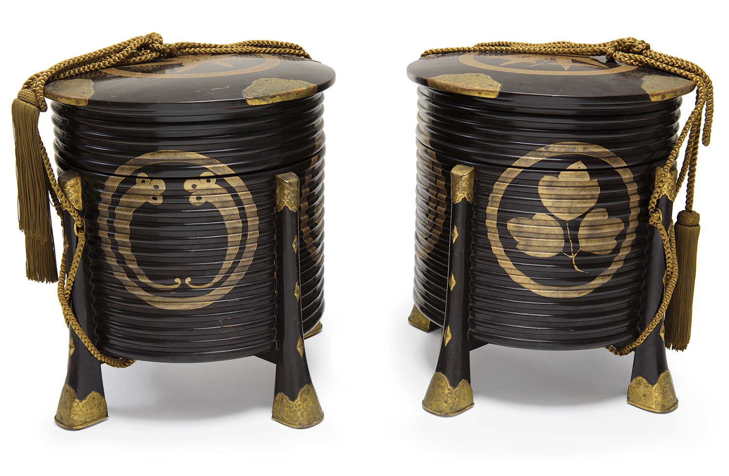 Pair of ceremonial food boxes for use at an aristocrat wedding. With main design of the two family crests (Kamon) joining in the union, bamboo leaves to top and delicate gilt copper Kanagu (metalwork fittings) and original silk ropes and tassels.