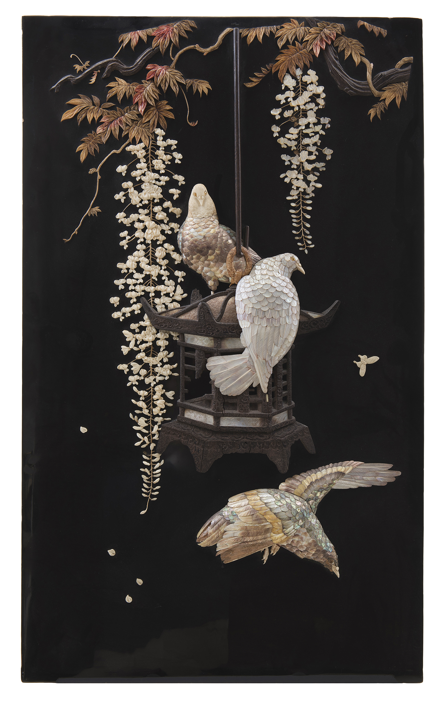 Losses to mother of pearly decoration including to the lowest bird's wing, face and neck, the uppermost bird's underside and front of leg, losses to four of the wisteria flowers, some cracking to the hanging lantern. Some small chips to the edges of the lacquer panel, and some light scratching. Unmounted.