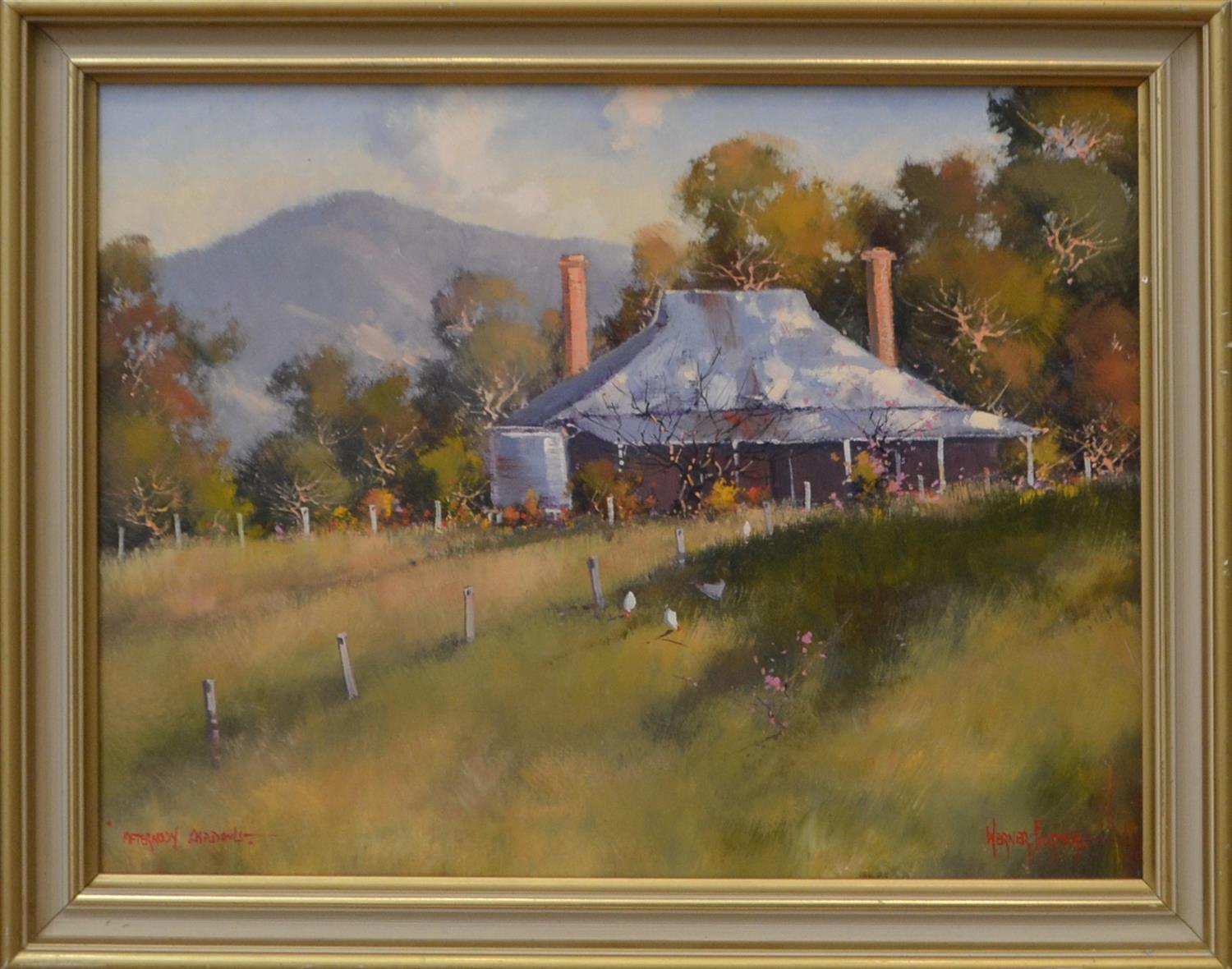 WERNER FULIPICH, AFTERNOON SHADOWS, OIL ON BOARD, IMAGE SIZE: 34 X 44CM, CONDITION: GOOD CONDITION, MINOR SURFACE SPOTS, FRAME SIZE: 42 X 52CM