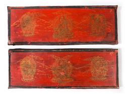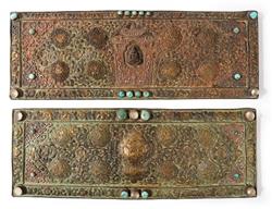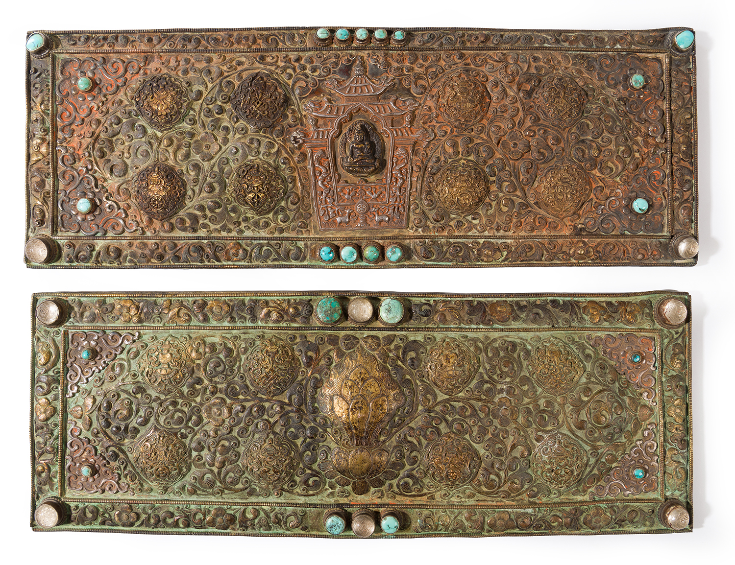 The book covers of painted wood with gilt decoration of lamas with yakshas to the inner surface. Encased in copper repousse depicting the eight precious Buddhists emblems amoungst scrolling foliage, decorated centrally to the front with a buddha within a temple to the reverse with a cintamani, further embellished with turquoise and rock crystal cabochons.