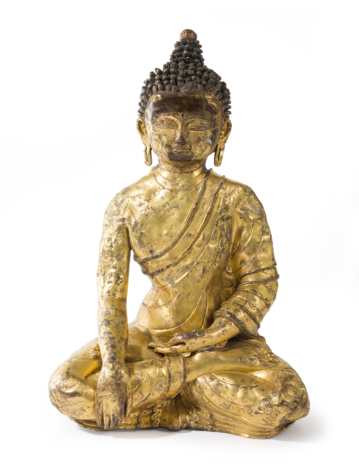 Significant denting to the entire sculpture. A large dent to the left shoulder and the left knee. Shallow and deep scratches. Multiple losses to gilding. Tears to the metal at the rear of the base. Possible area of restoration to the figures forehead and cheek with losses of gilding to those places. The figure's right ear probably detached and reattached.