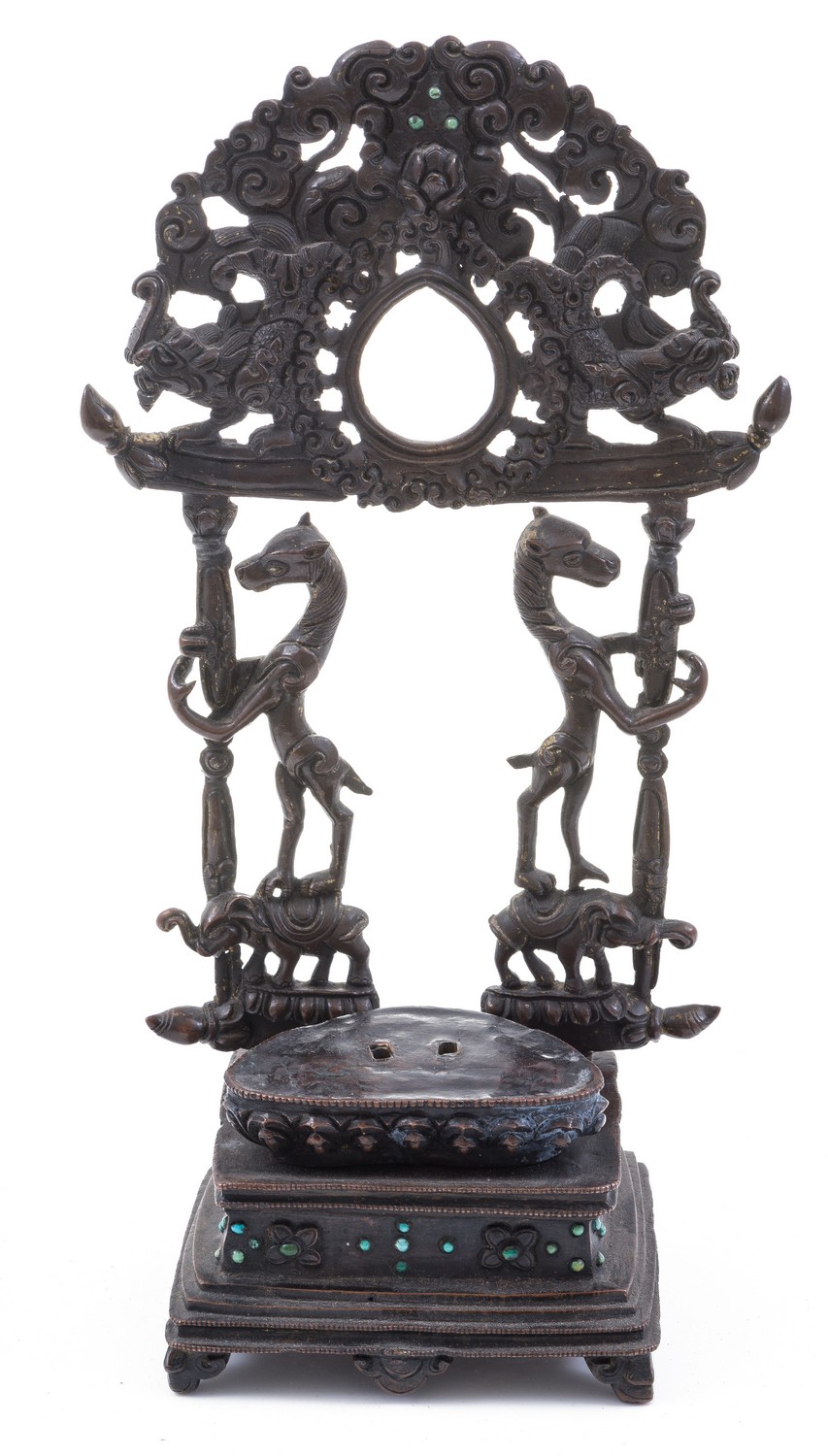 The base modelled as a single lotus platform on a squared base, the mandorla held up by pillars supported by archaistic lions resting on elephants, the mandorla itself flanked by makara.