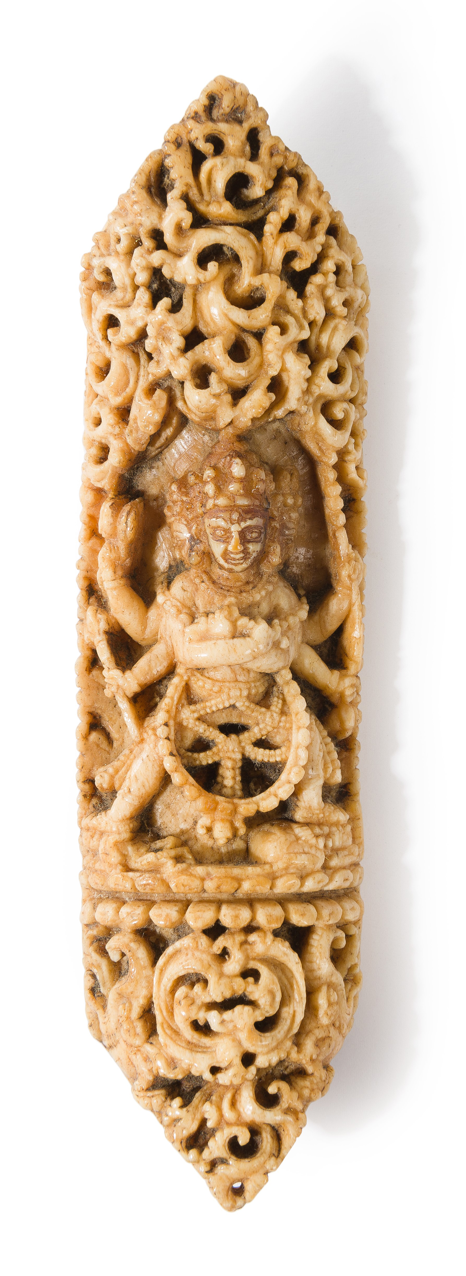 The plaque from a priest's apron, elaborately carved to depict chakrasanvara holding attributes in six hands, astride two human figures on a double lotus base amoungst scrolling foliage and makaras