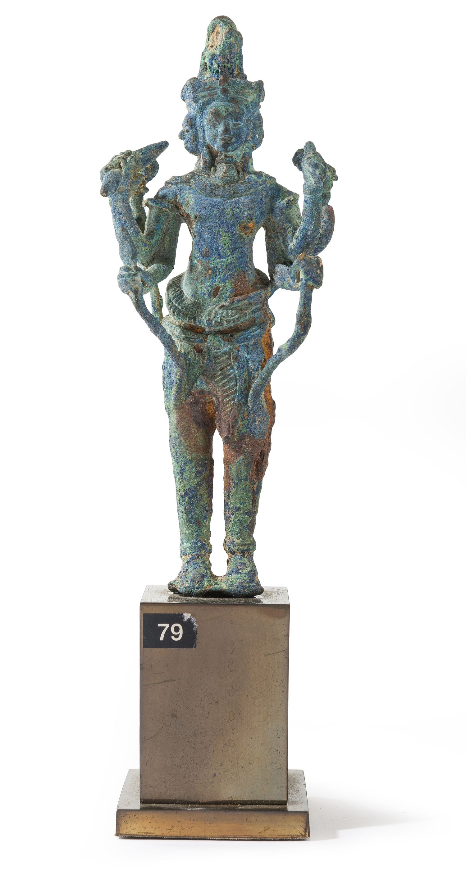 A KHMER BRONZE SIX-ARMED STANDING DEITY