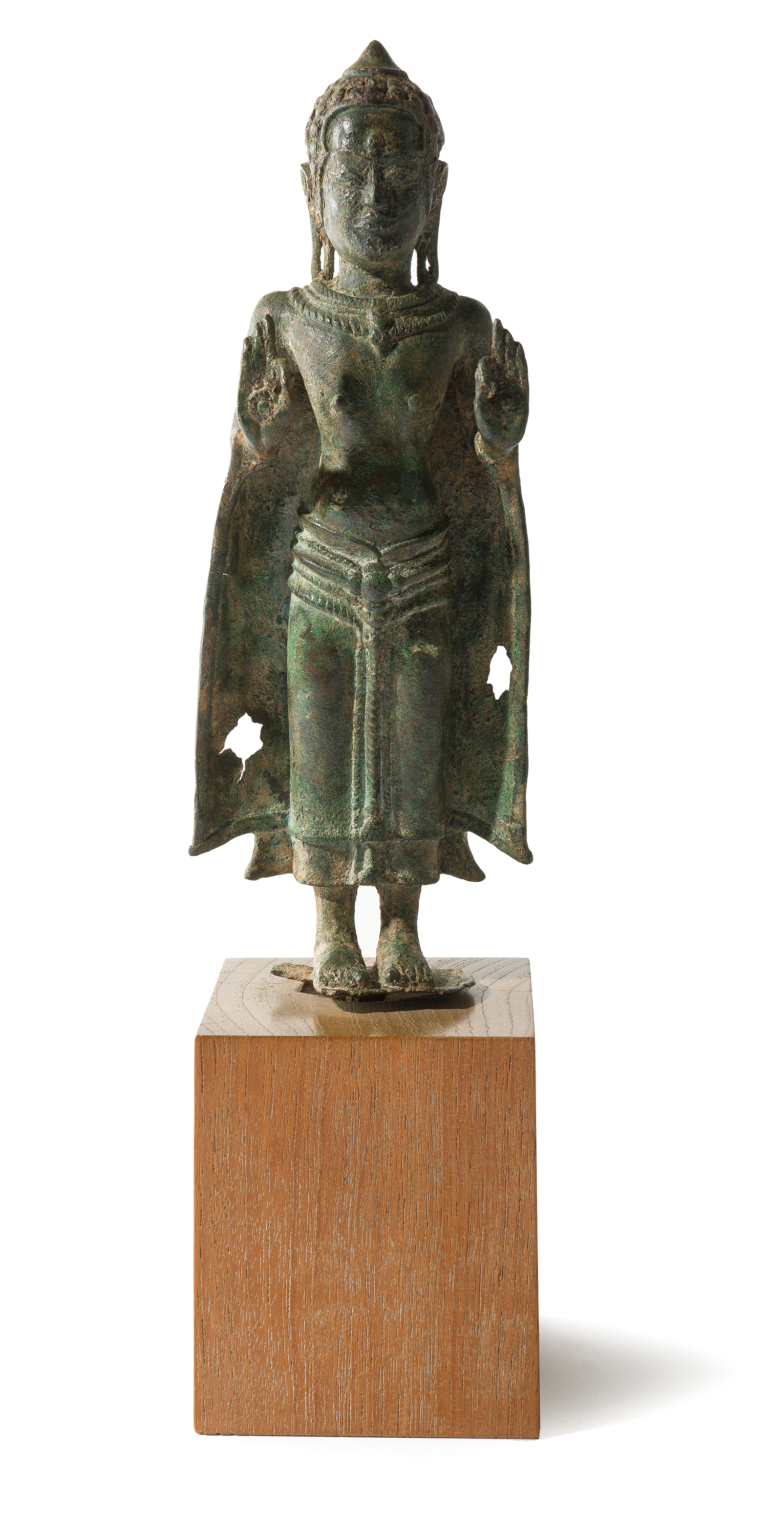 Both hands in abhaya mudra with a cloak and elaborately tied dhoti, with a pleasant verdigris patina. Fitted wooden stand.