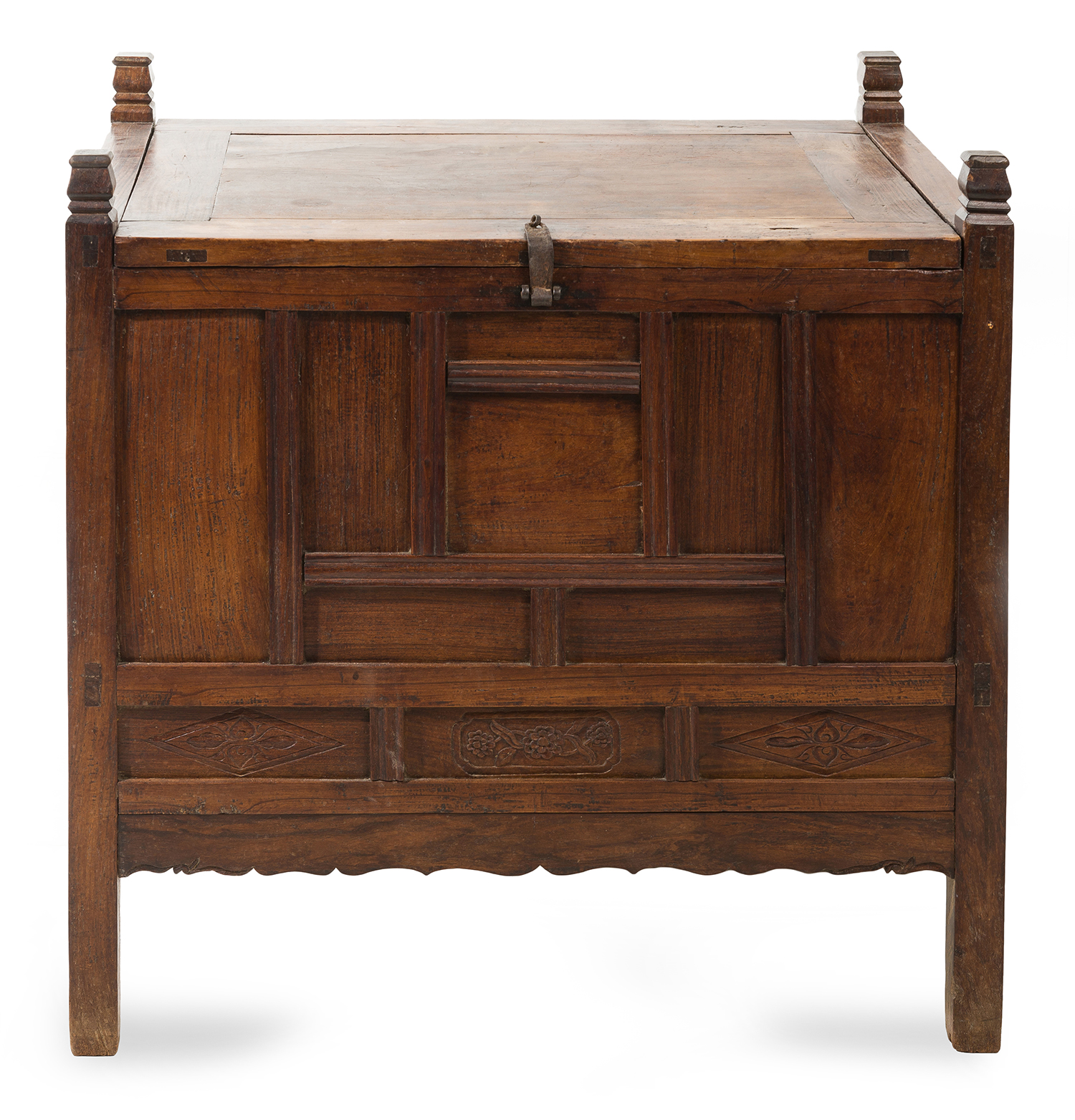 The front composed of multiple rectangular panels, the three lower panels with carved decoration of lotus buds and prunus flowers. With original iron hardware. The wood of rich colour and patina.