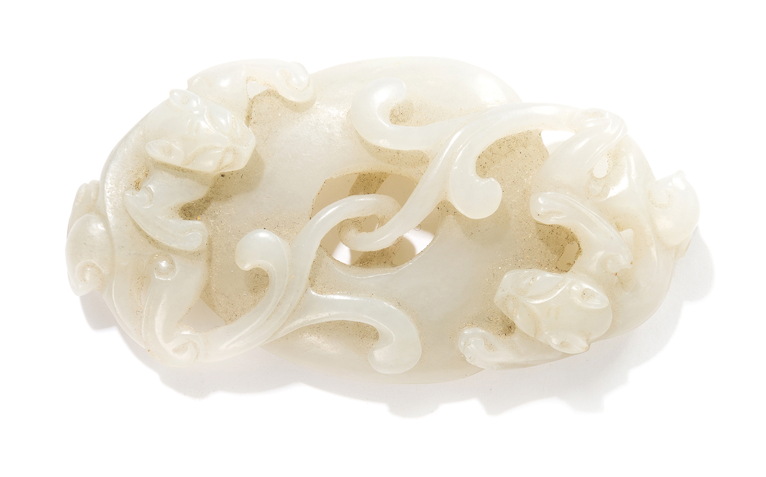 The jade carved with two qilongs with tails entwined circling around a pierced lozenge shape.