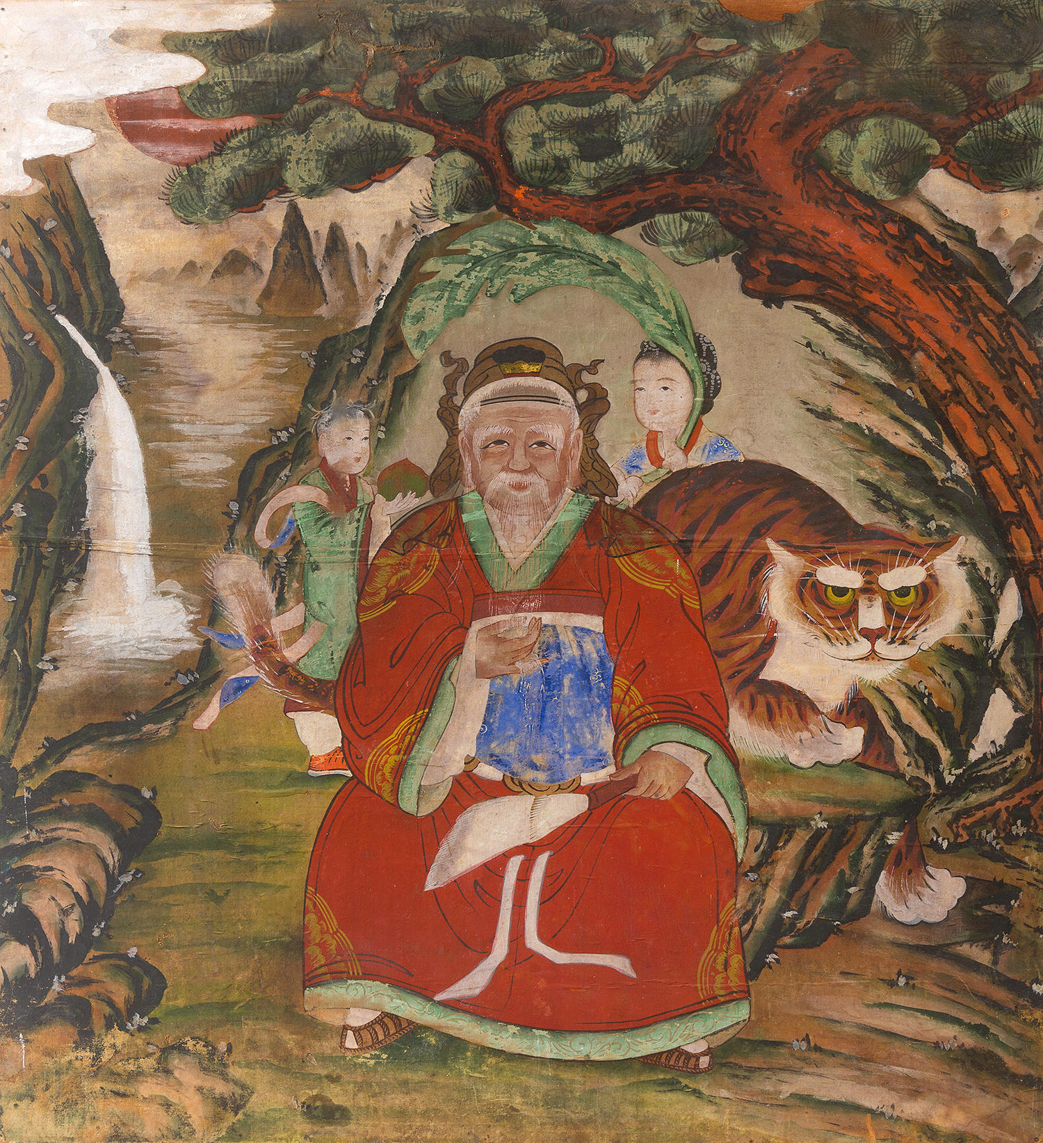 A KOREAN PAINTING OF A CONFUCIAN FIGURE WITH A TIGER