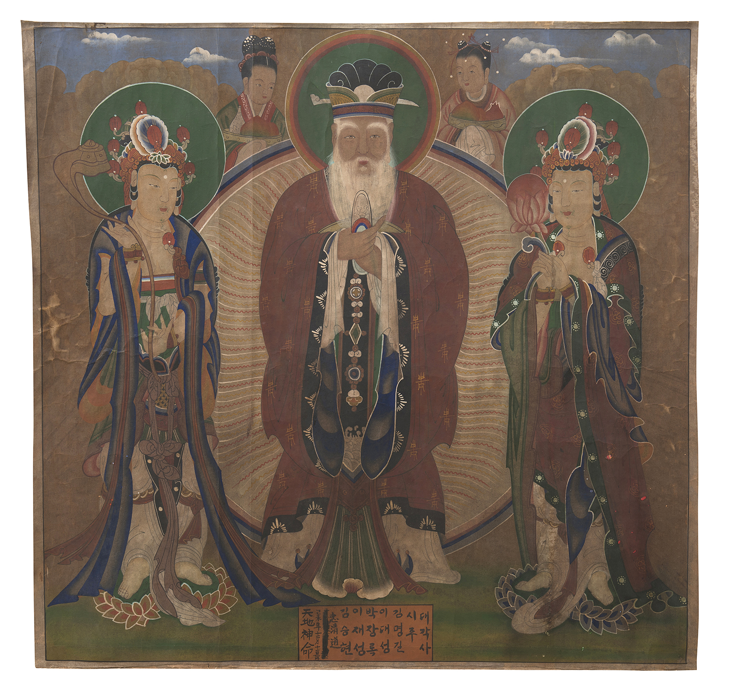 Two pronounced vertical creases to the left side of the image, between the central figure and the flanking figure. Some small orange paint flecks atached to the right hand lower section of the painting. The image is somewhat darkened through age/smoke from lamps. Otherwise no further visible faults or damage.