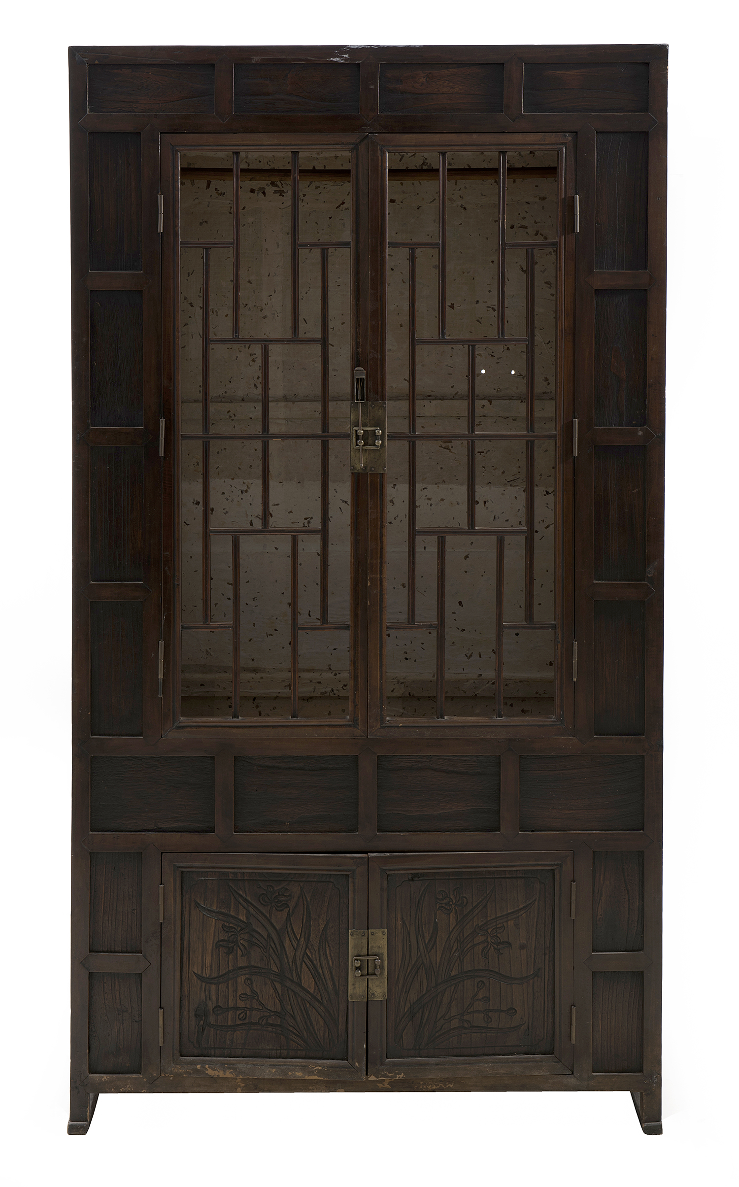 The rectangular cabinet with two open-work doors to the front, lined with paper, above two carved lower panels.