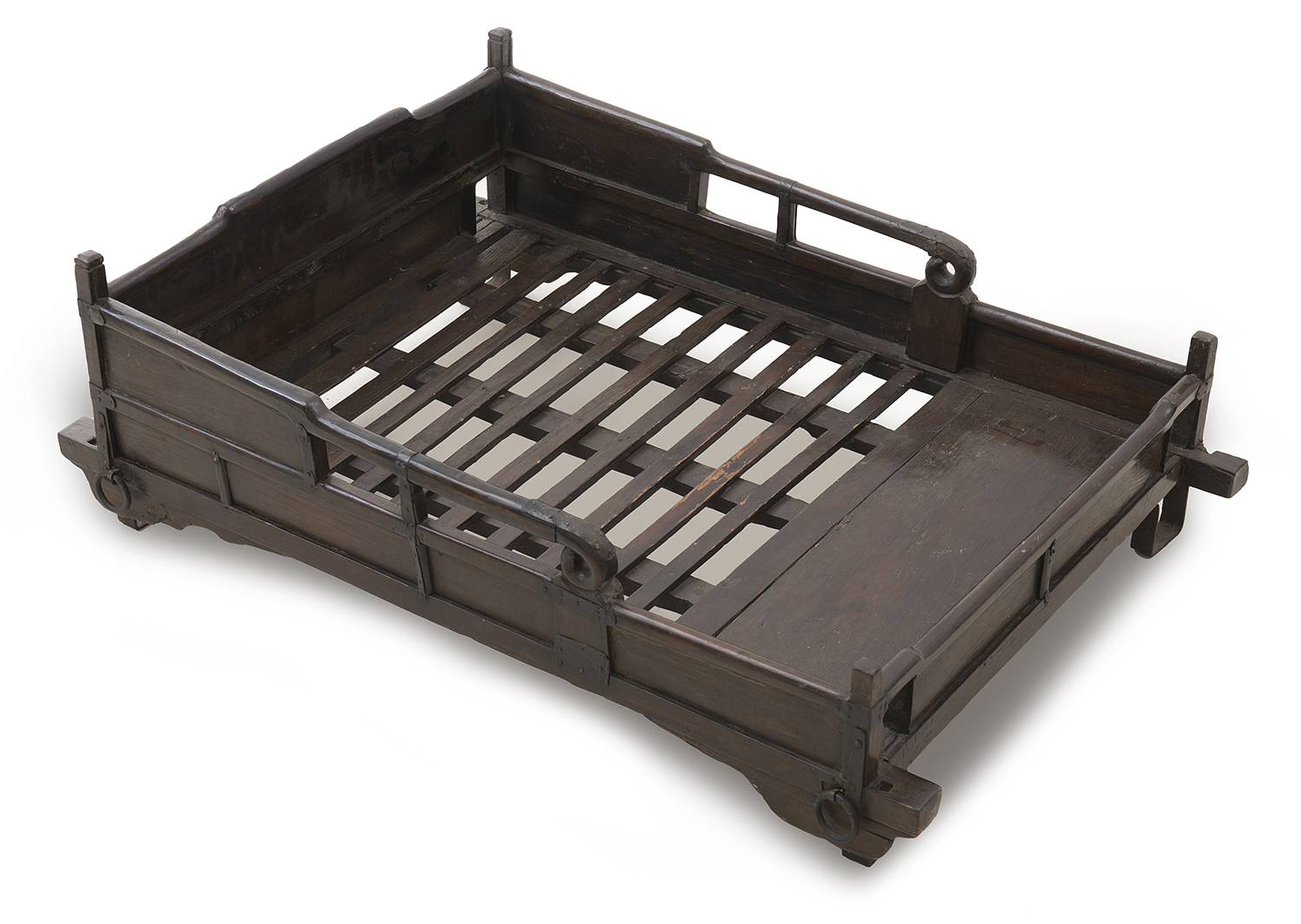Of simple box construction, with a slatted base, with railings along either side, and original iron hardware mounts including rings and square section openings for carrying poles.