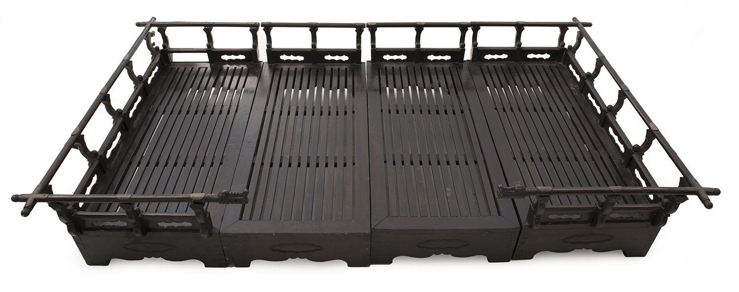 Made in dark lacquered elm, in four pieces probably for travelling. Consisting of a box frame with slats on top to allow air flow during the hot summer months, with balustrade surrounding three of the four sides, with carved dragon-form ends to the balustrade, the sides of the box-frames relief-carved with ruyi mushroom shaped reserves to each side.
