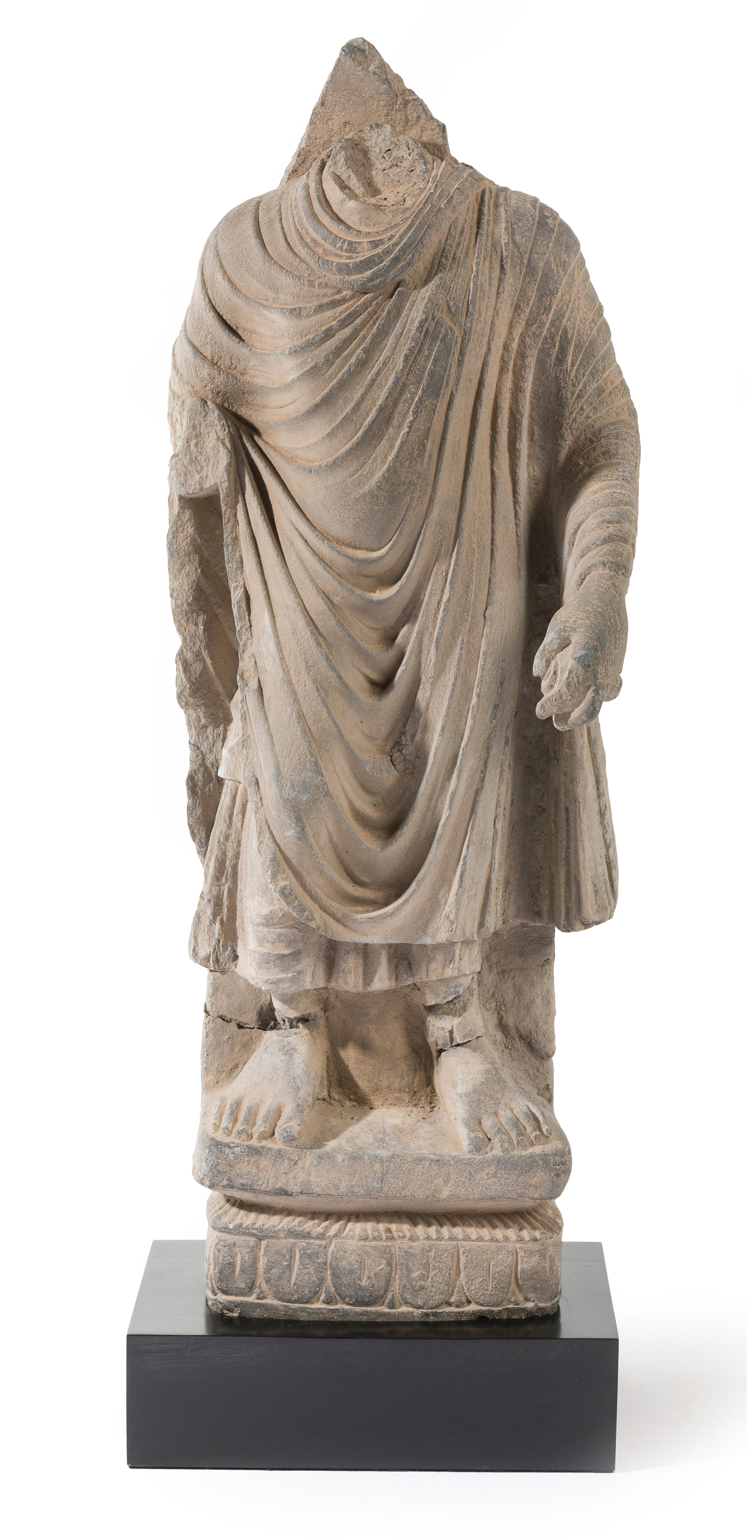 The figure standing on a lotus base wearing a long robe with folds, carved from grey schist.