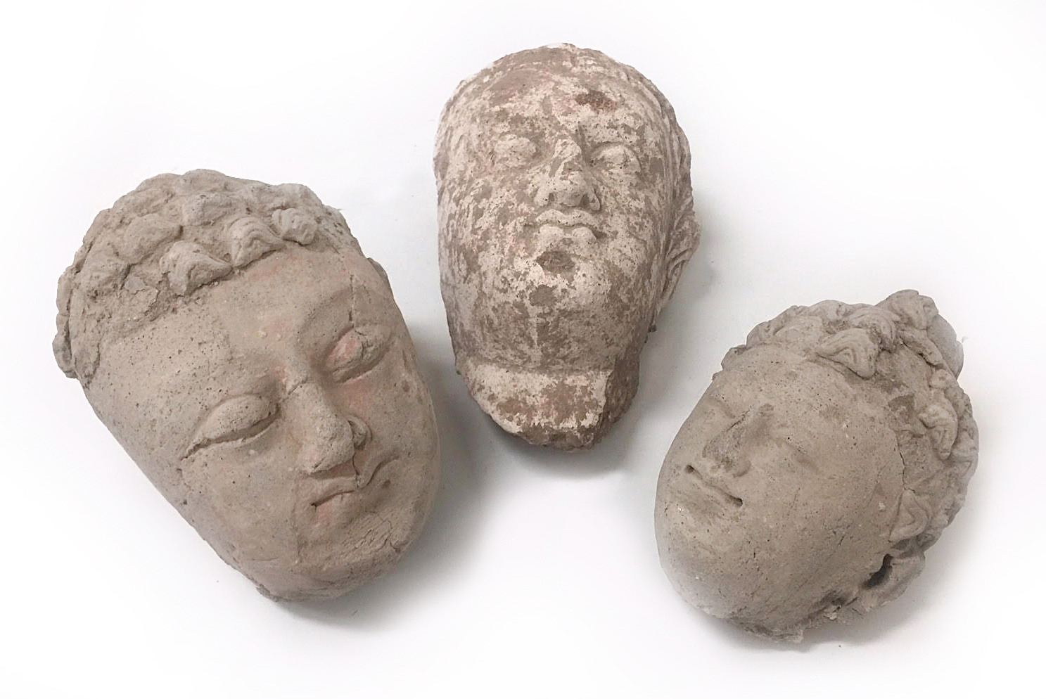 Modelled as Bodhisattva heads in stucco, some traces of pigment remaining.