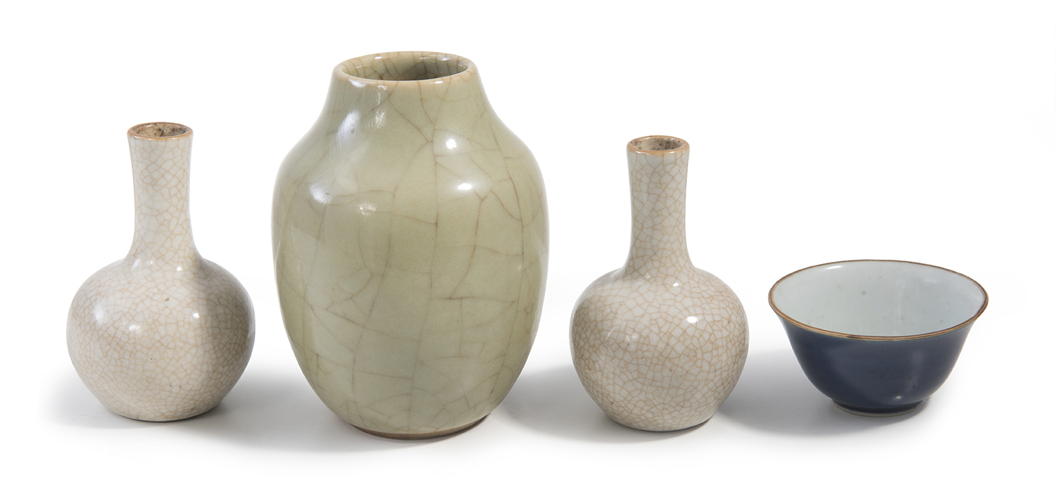 Consisting of a vase of pouch form, covered in a thick yellowish-brown glaze with a broad guan-type crackle (18th/19th century), a pair of vases in yuhuchunping form with a white glaze with a ge-tye crackle (19th century), and a small bowl with blue exterior and brown dressing to the rim (17th century).